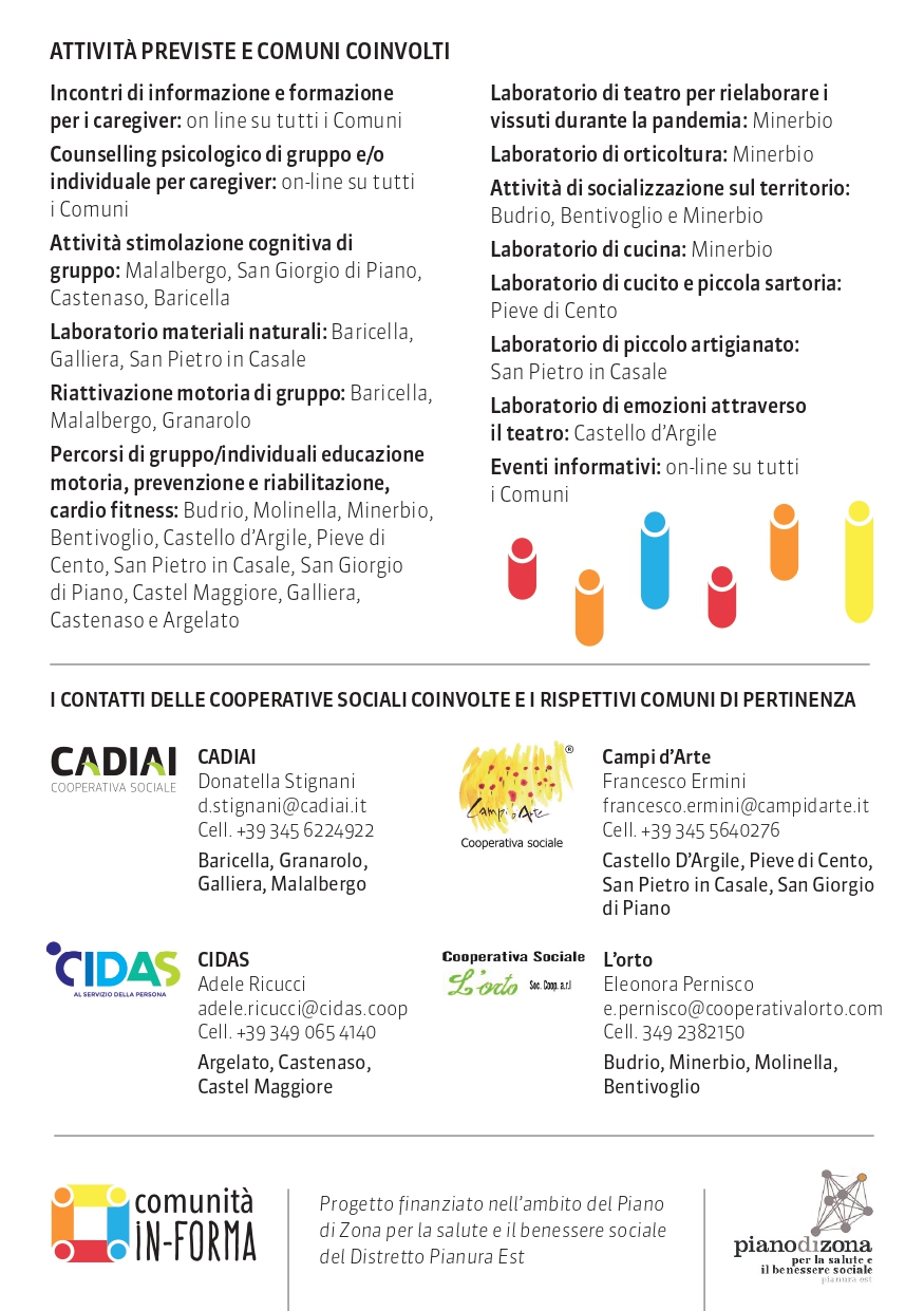 il progetto si propone di offrire, alle persone fragili, laboratori e attività di stimolazione corpo-mente e opportunità ludico-ricreative, culturali, riabilitative per favorire il loro benessere psico-fisico; e a volontari, associazioni del territorio e cittadini percorsi formativi on-line affinché riescano a cogliere i primi segnali di pre fragilità così da contribuire a migliorare la qualità di vita delle persone e prevenire situazioni di disagio, solitudine e aggravamento. Quanto poi ai CAREGIVER, il progetto intende mettere a loro disposizione momenti di info-formazione on-line in piccolo gruppo su temi dell’invecchiamento e dei fattori ambientali e sociali che impattano su persone con disabilità, e garantire un serivizio di counselling psicologico di gruppo e/o individuale on line per il superamento delle difficoltà emotive e attivazione di risorse e strategie per la loro risoluzione.