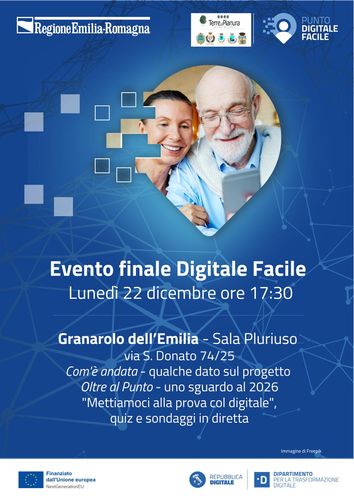 Lunedì 22 dicembre alle 17:30 nella Sala Pluriuso del Comune di Granarolo dell’Emilia, si terrà l’evento conclusivo del progetto Digitale Facile.