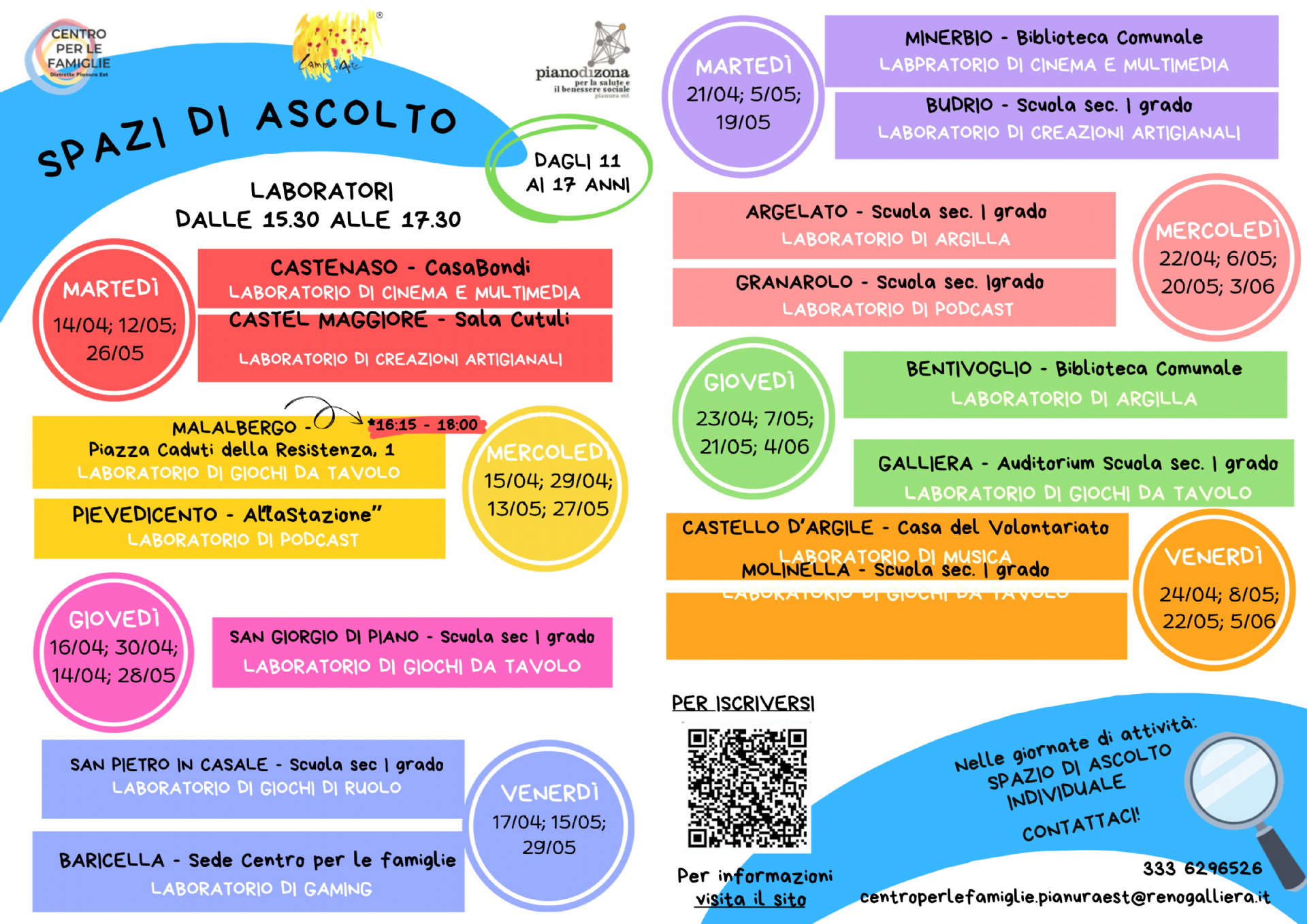 In allegato i volantini relativi al nuovo ciclo attività che saranno proposte nel periodo 14 aprile-5 giugno nell'ambito degli Spazi di ascolto per adolescenti e preadolescenti del Centro per le Famiglie.