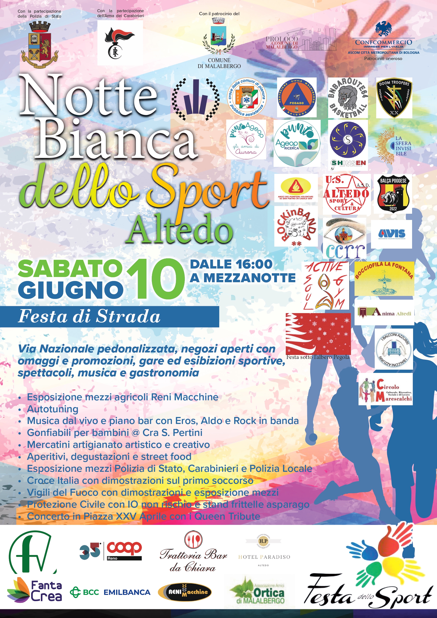 Il 10 giugno la strada statale Porrettana sarà chiusa dal primo pomeriggio fino all’1 di notte, ospitando le manifestazioni sportive, gli stand e i veicoli di Carabinieri, Polizia di Stato, Polizia Locale, Vigili del Fuoco, Protezione Civile, Croce Italia e Il mercato dei creativi dell’Associazione Fantacrea di Budrio, nonché punti ristoro e street food.