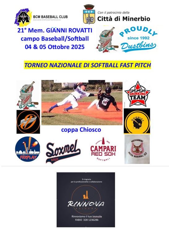 Sabato 4 e Domenica 5 ottobre 2025 BCM Baseball Club organizza il 21° MEMORIAL GIANNI ROVATTI presso Campo da Baseball di Minerbio (Via Don Zamboni, 5), torneo nazionale F.I.B.S. di Softball amatoriale.