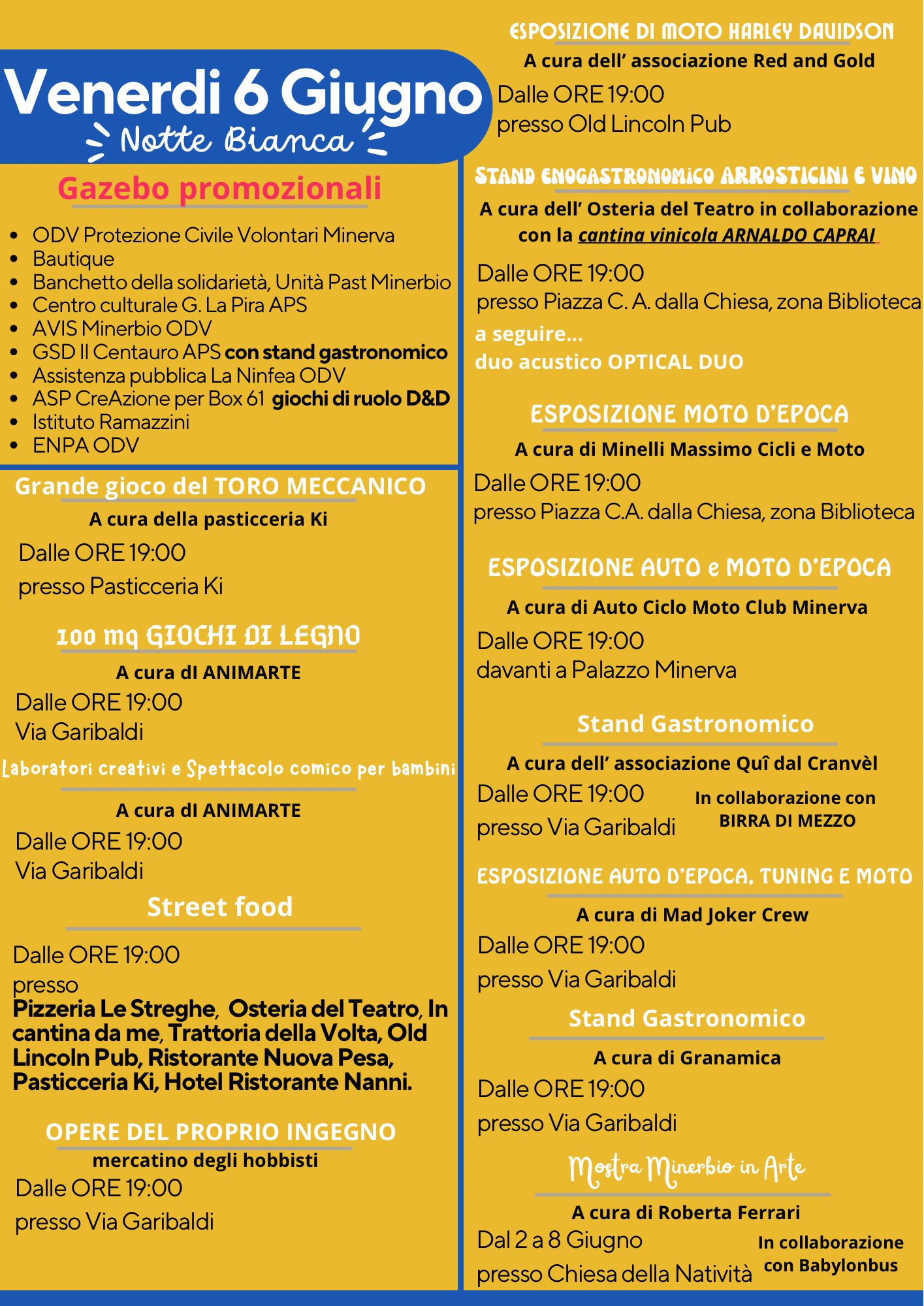 - gazebo promozionali di : ODV Protezione Civile Volontari Minerva, Bautique, Banchetto della Solidarietà, Unità Past Minerbio, Centro Culturale G. La Pira APS, Avis Minerbio ODV, GSD il Centauro APS con stand gastronomico, Assistenza pubblica La Ninfea ODV, APS CreAzione per Box61, Istituto Ramazzini
