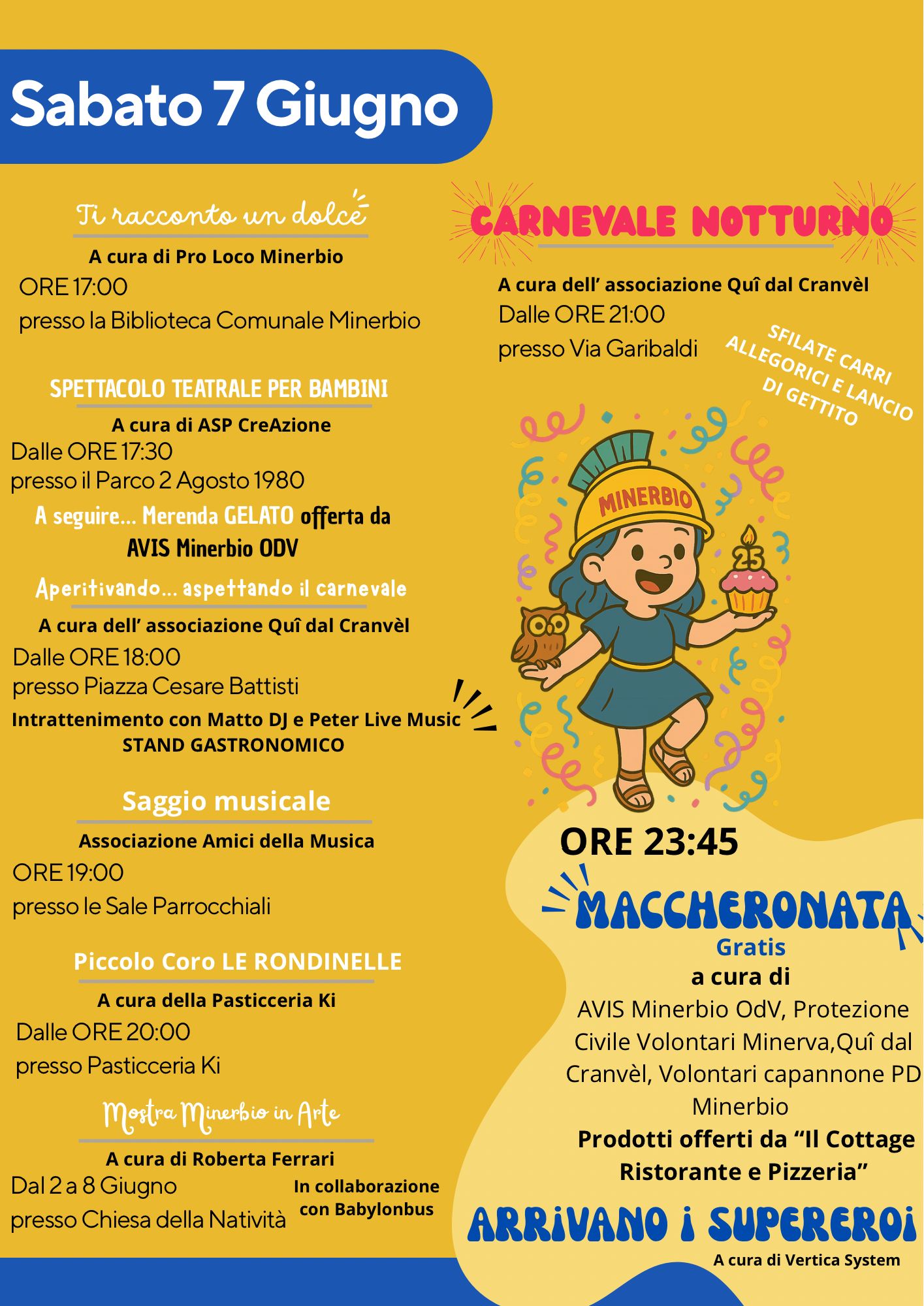 - MACCHERONATA gratis a cura di AVIS Minerbio, Protezione Civile Volontari Minerva, Qui dal Cranvèl, Volontari Capannone PD Minerbio. Prodotti offerti da "Il Cottage Ristorante Pizzeria"