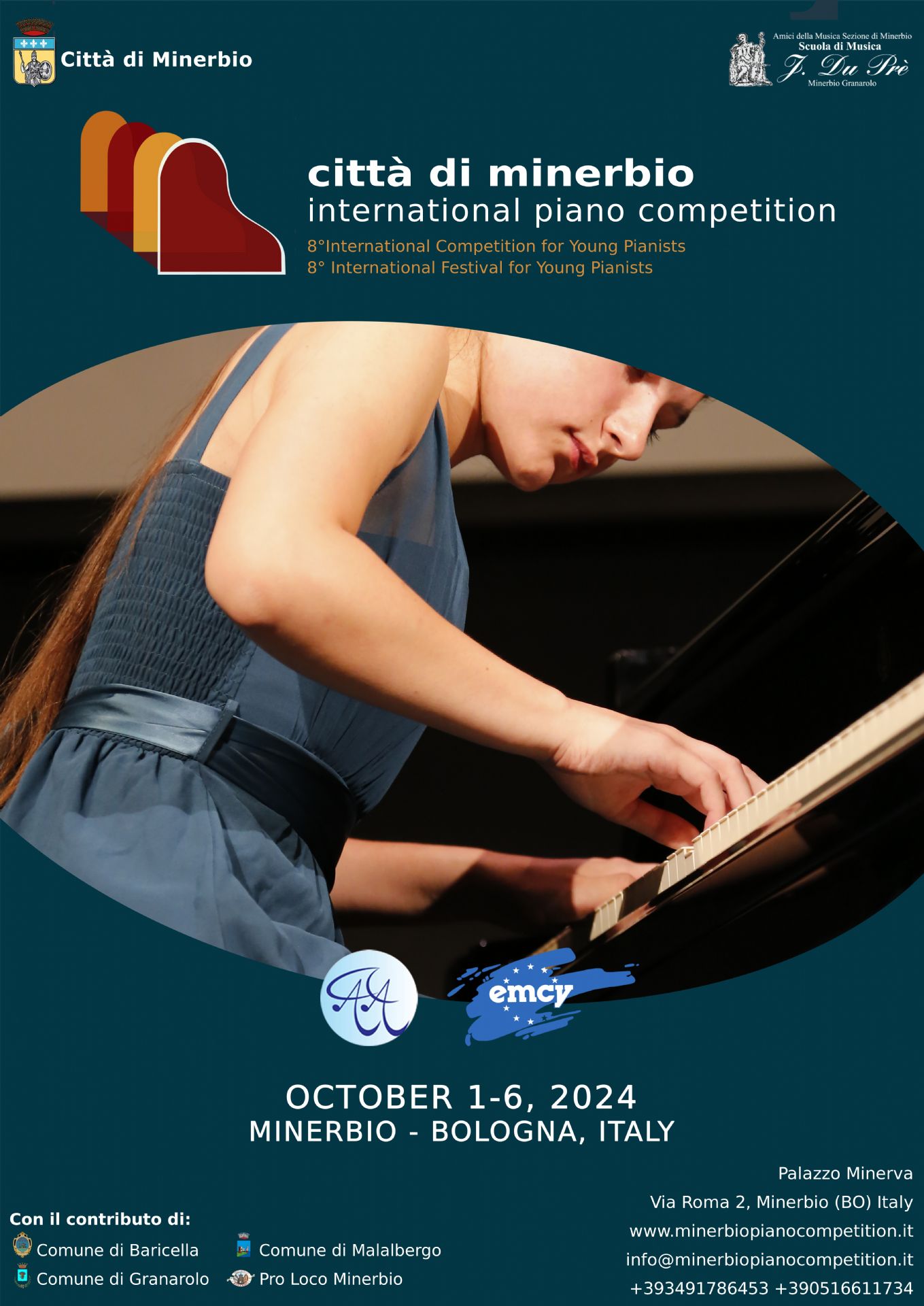 Dall'1 al 6 ottobre 2024 la Città di Minerbio ospiterà l'ottava edizione del Concorso Pianistico Internazionale "Città di Minerbio": un calendario ricco di concerti diffusi per il territorio minerbiese e nei comuni limitrofi di Baricella, Granarolo dell'Emilia e Malalbergo, organizzato dall'associazione Amici della Musica Scuola di musica J. Du Prè Minerbio e Granarolo dell'Emilia, con il patrocinio e il contributo del Comune di Minerbio.