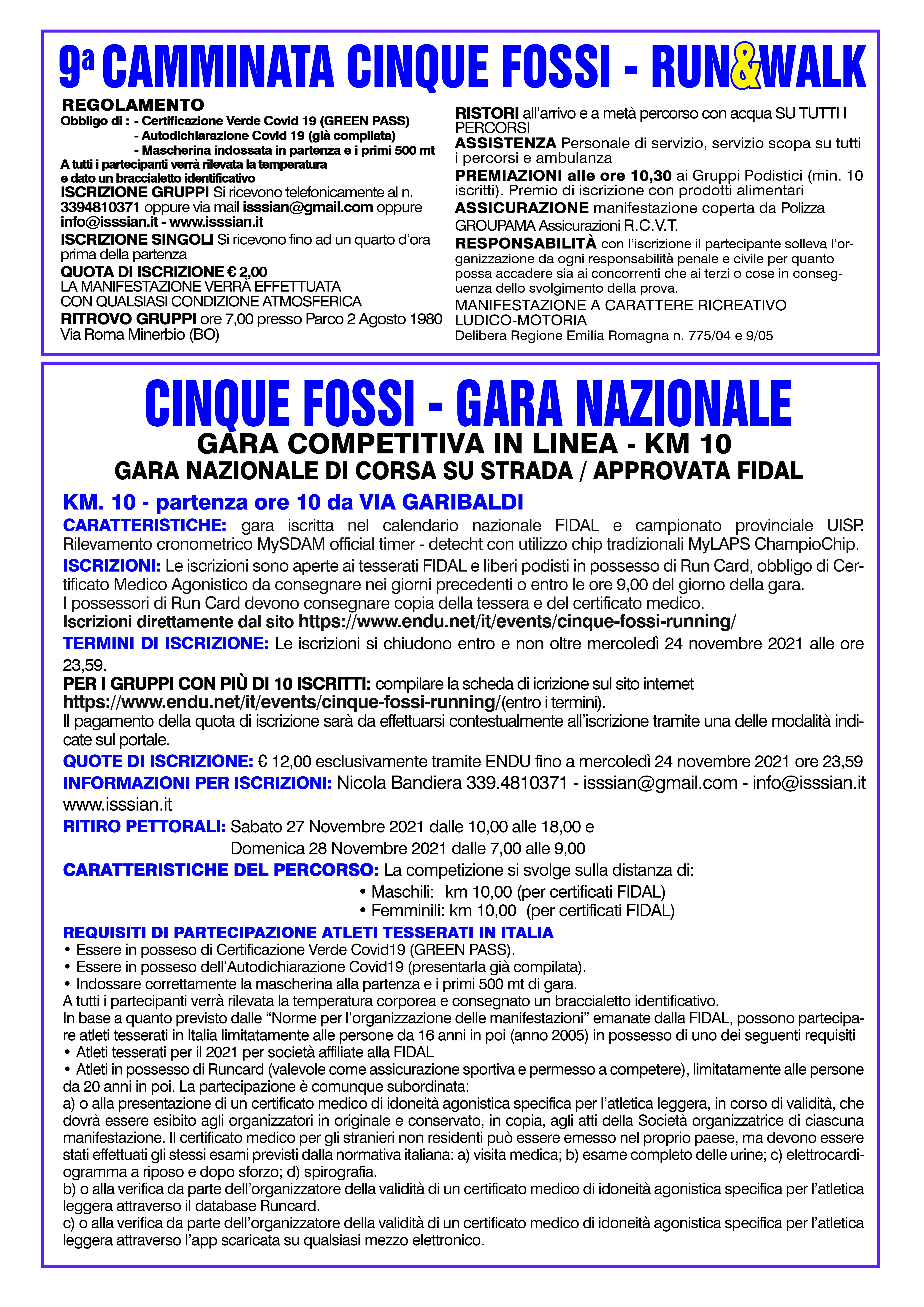 Torna domenica 28 Novembre, a partire dalle ore 9.00 la 9° edizione della "CINQUE FOSSI -RUN&WALK", Camminata e Gara nazionale.