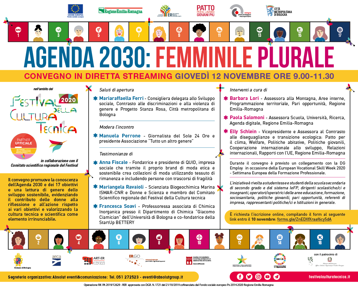 Nell'ambito del Festival della Cultura Tecnica 2020 è organizzato il convegno "Agenda 2030: Femminile Plurale" il 12 Novembre dalle ore 9.00 alle ore 11.30, in diretta streaming.