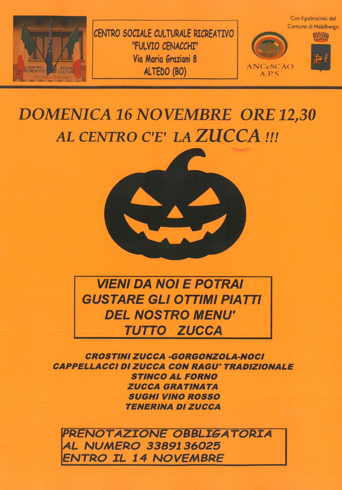 Prenotazione obbligatoria : 338/9136025 entro il 14/11