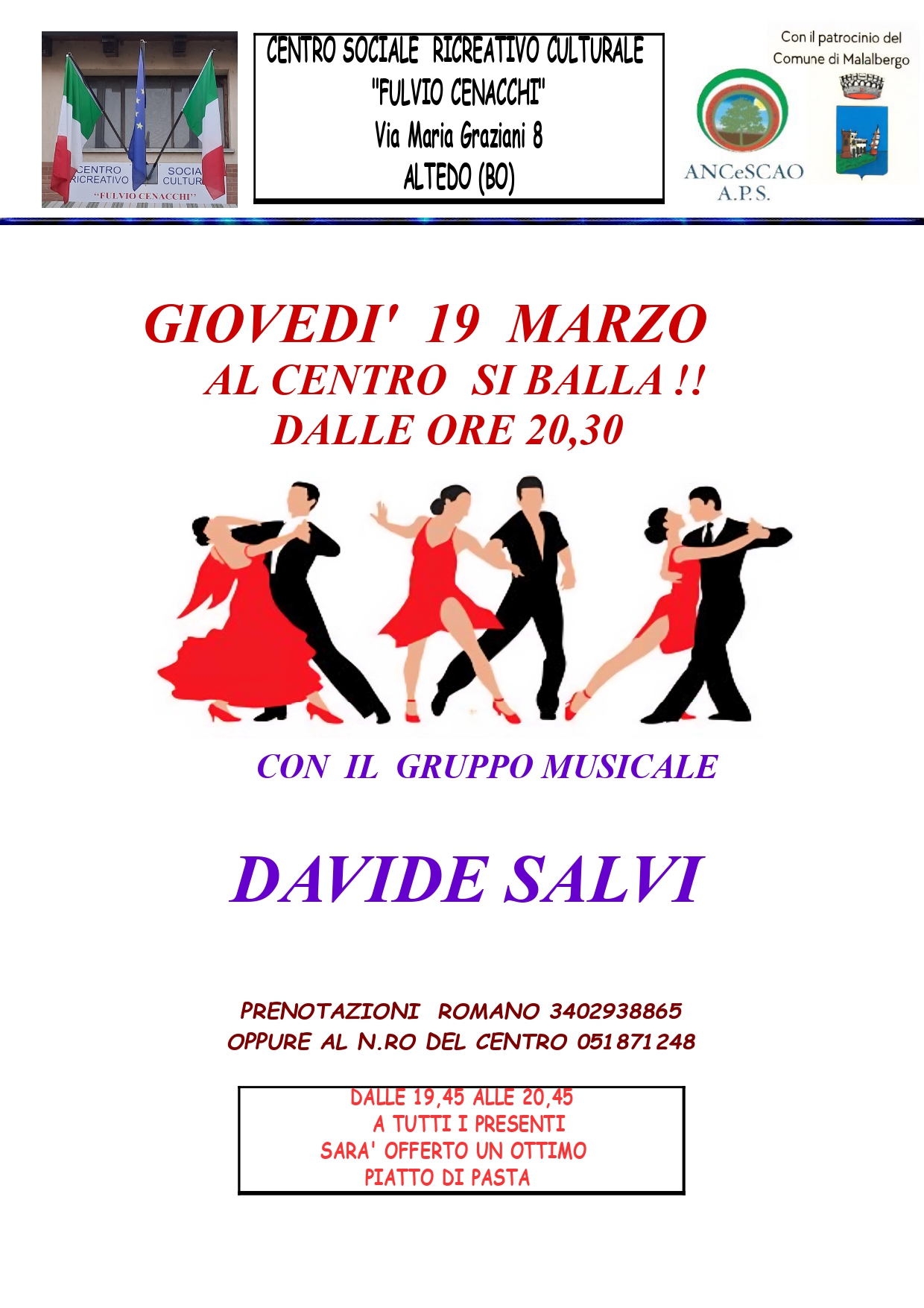 Al Centro si balla! Serata danzante con il Gruppo Musicale Davide Salvi. Dalle ore 19:45 alle 20:45 a tutti i partecipanti verrà offerto un piatto di ottima pasta al Centro Sociale Ricreativo Culturale "Fulvio Cenacchi", Via M. Graziani n.8 ad Altedo.