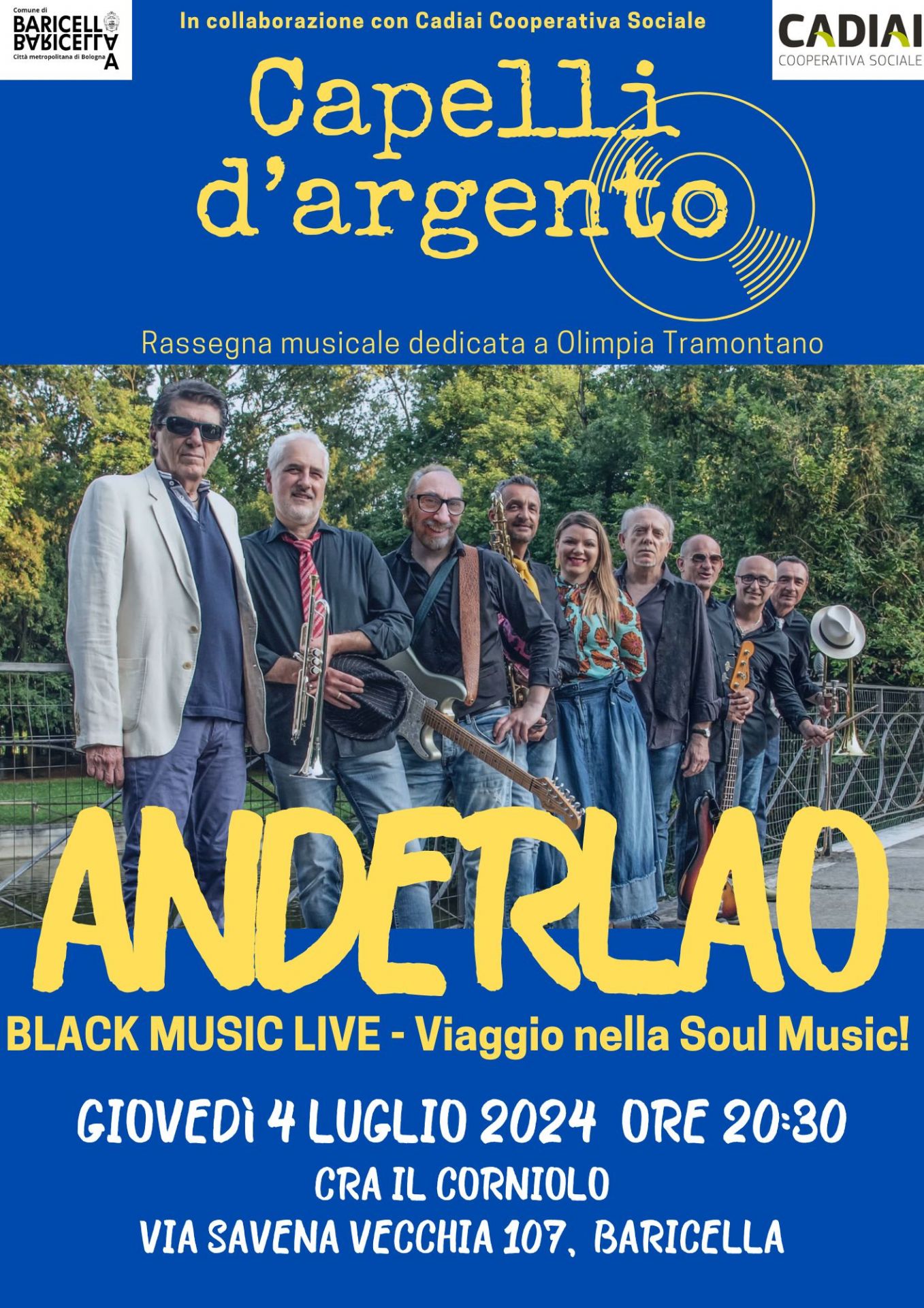 Nell'ambito della 26° edizione della Rassegna musicale "Capelli d'Argento" vi aspettiamo a Baricella dalle 20 e 30 presso la residenza per anziani "Il Corniolo" in Via Savena Vecchia 107, dove si terrà il concerto dell'ANDERLAO BAND, un gruppo composto da nove brillanti elementi, uniti dalla passione per la musica soul e r&b, che propone pezzi tra i più gettonatati e rappresentativi della black music degli anni '60 e '70.
