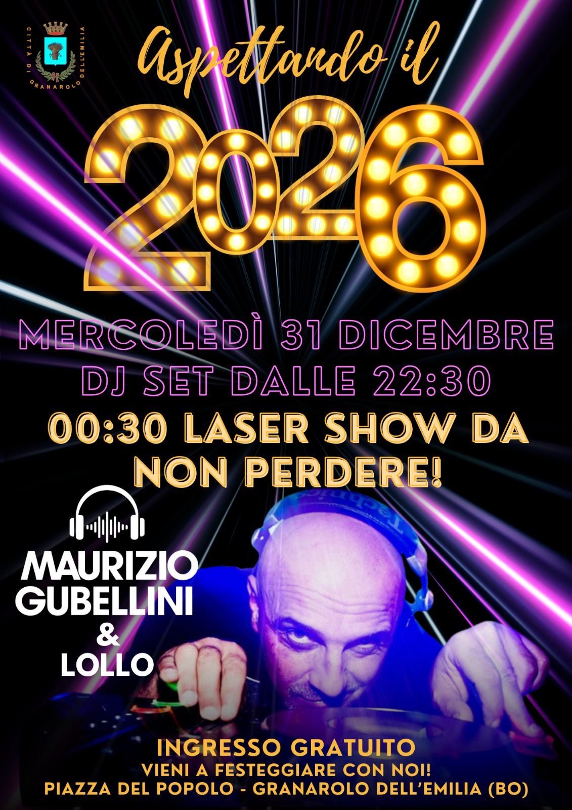 Granarolo dell’Emilia festeggia per la prima volta il Capodanno in Piazza del Popolo con un DJ Set, countdown collettivo, Laser Show e musica fino alle 2 del mattino