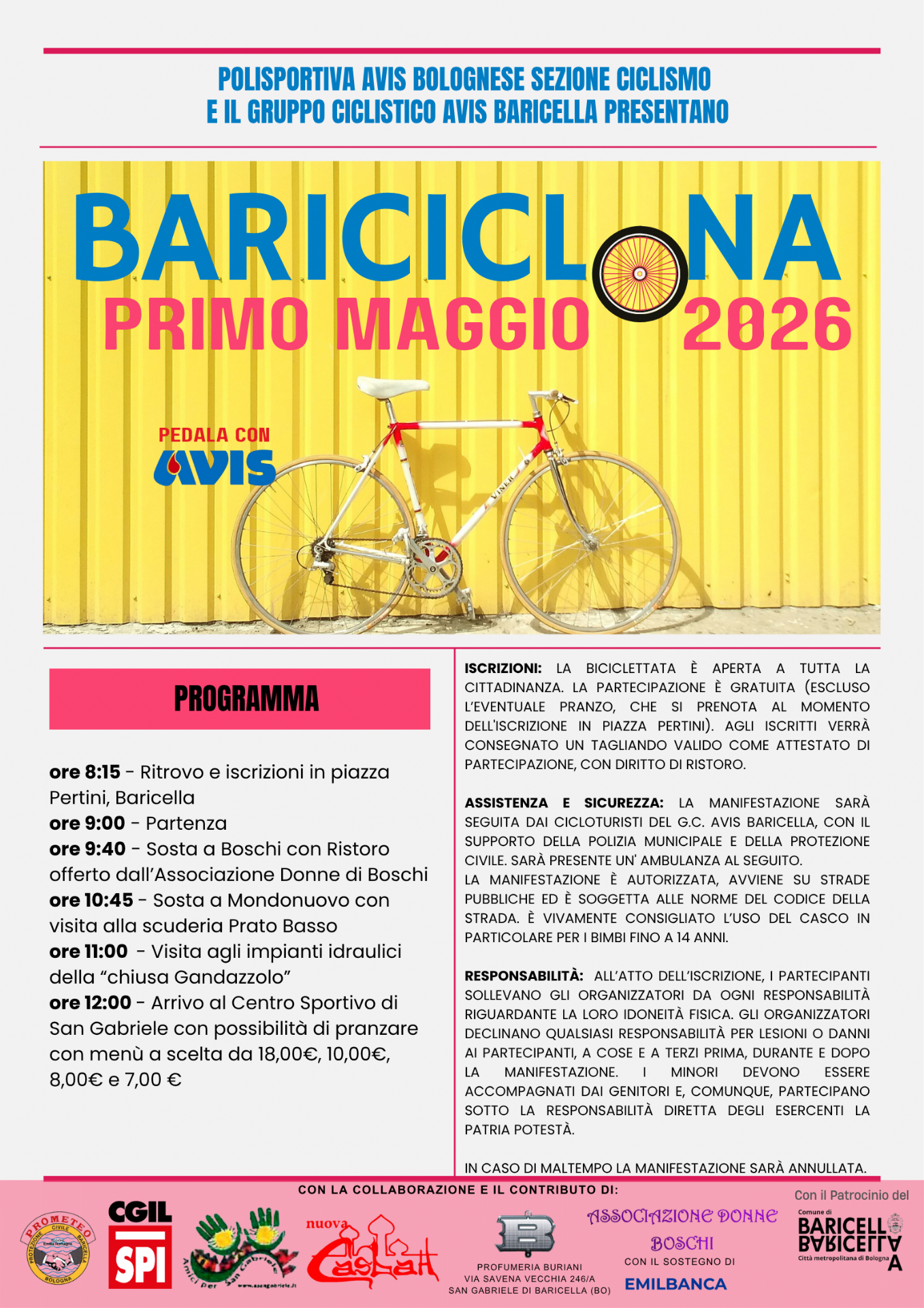 Torna la tradizionale pedalata del Primo Maggio di Baricella organizzata dal Gruppo territoriale Baricella della Polisportiva Avis Bolognese, sezione ciclismo.