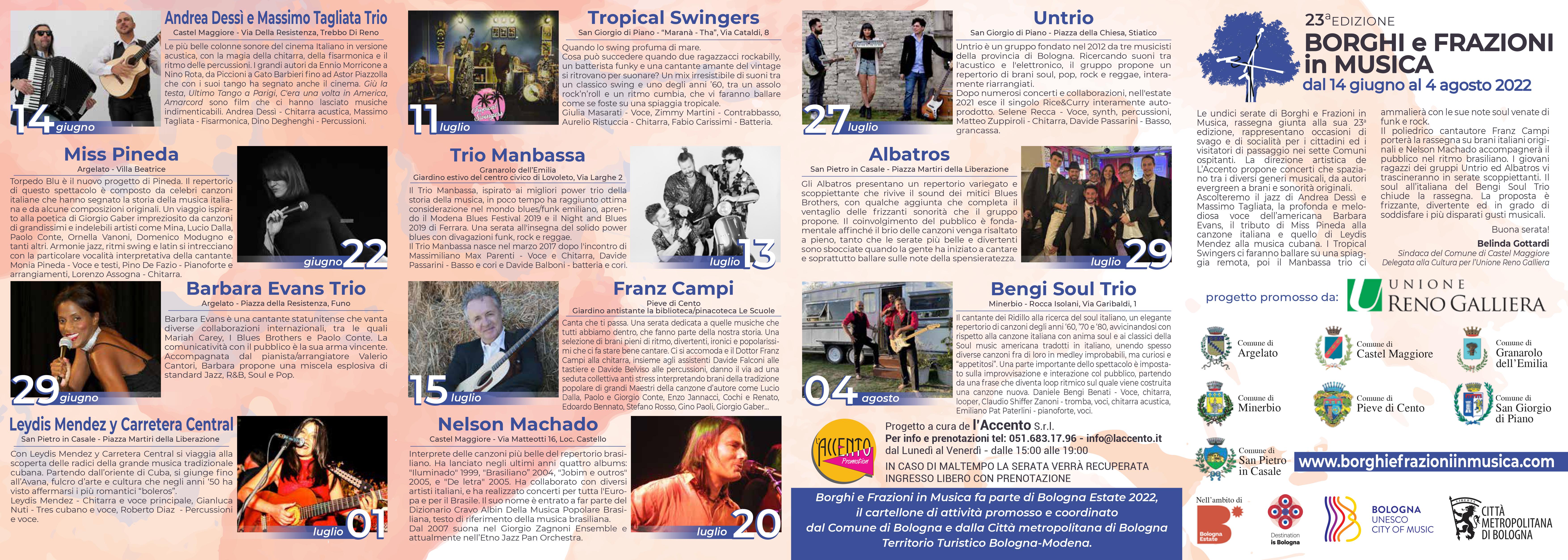 Borghi e Frazioni in Musica è giunta alla sua 23° edizione. Anche quest’anno la rassegna è inserita nel cartellone di Bologna Estate. Undici serate in sette Comuni, con un ventaglio di proposte musicali tra tradizione e attualità.