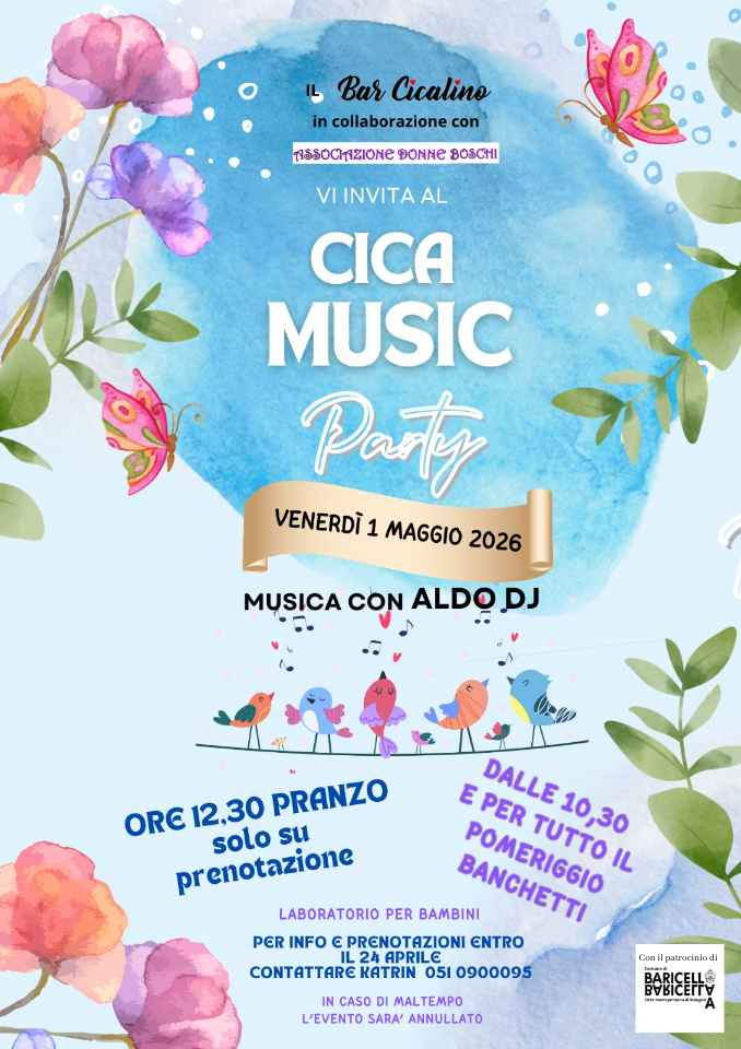 Il Bar Cicalino, in collaborazione con l'Associazione Donne Boschi e con il patrocinio del Comune di Baricella, vi invita a festeggiare il Primo Maggio con una giornata di musica e divertimento.