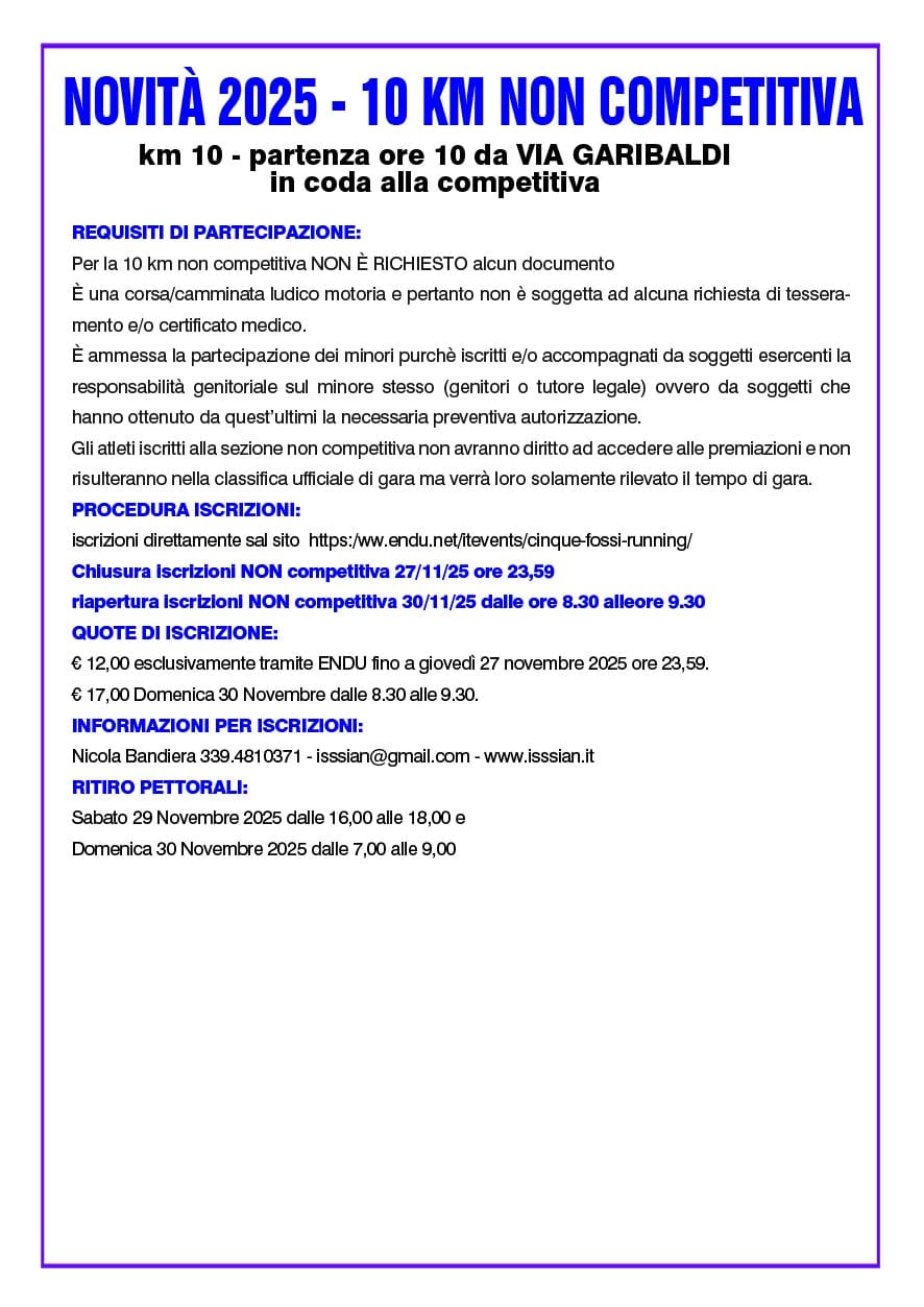 La camminata ludico-motoria Km 3-5,7-12,5 partirà alle ore 9 mentre la Gara Nazionale Km 10 partirà alle ore 10.