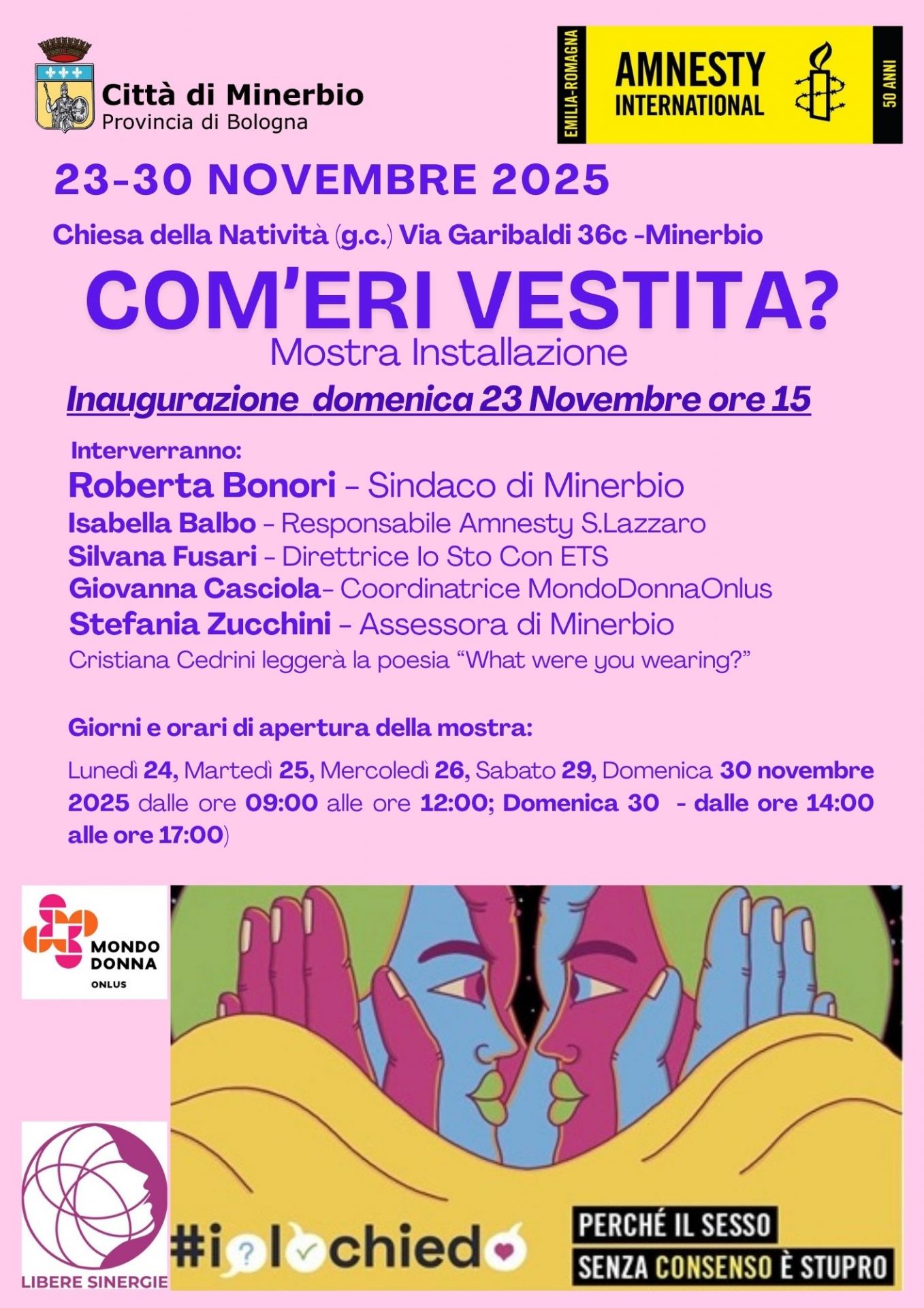 Dal 23 al 30 novembre 2025 presso la Chiesa della Natività (g.c.), Via Garibaldi 36c, si terrà una mostra-installazione dal titolo “Com’eri vestita?”, un progetto che invita a riflettere sugli stereotipi e sulle ingiustizie legate alla violenza di genere.