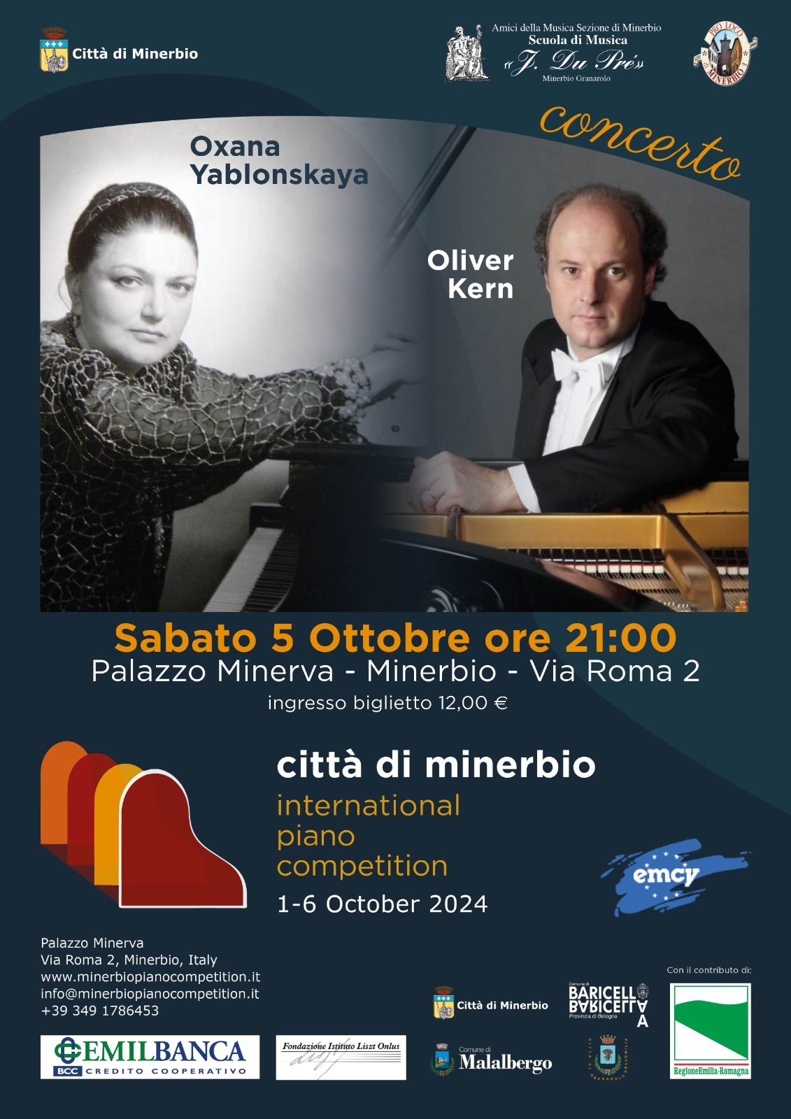 Sabato 5 ottobre 2024 alle ore 21.00 a Palazzo Minerva a Minerbio si terrà il concerto per pianoforte dei Maestri Maestri Oxana Yablonskaya e Oliver Kern, all'interno dell'8° edizione del Concorso Pianistico internazionale "Città di Minerbio".