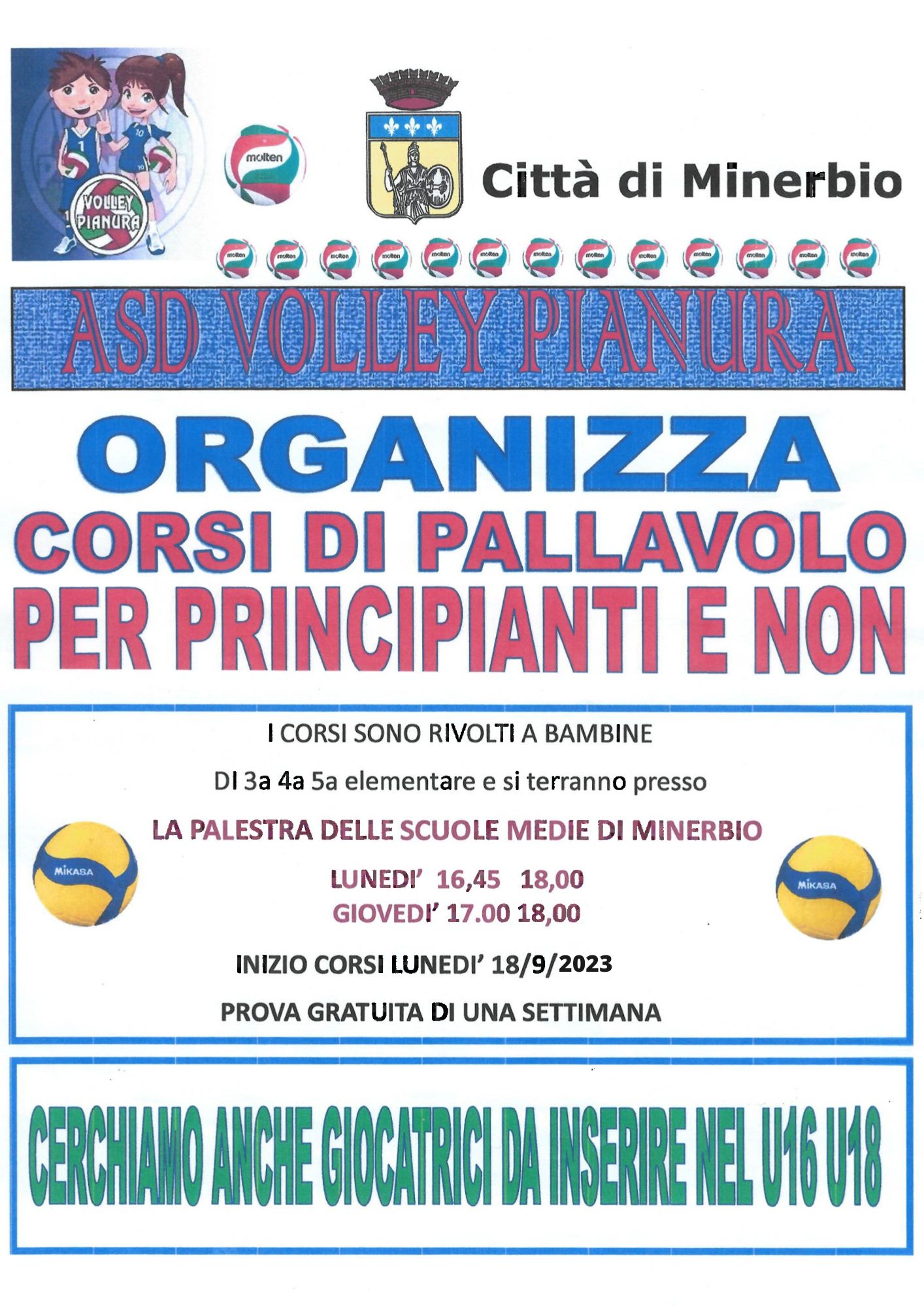 L'ASD Volley Pianura organizza Corsi di Pallavolo per principianti e non presso la Palestra della Scuola secondaria di Primo grado di Minerbio il lunedì dalle 16.45 alle 18.00 e il giovedì dalle 17.00 alle 18.00.