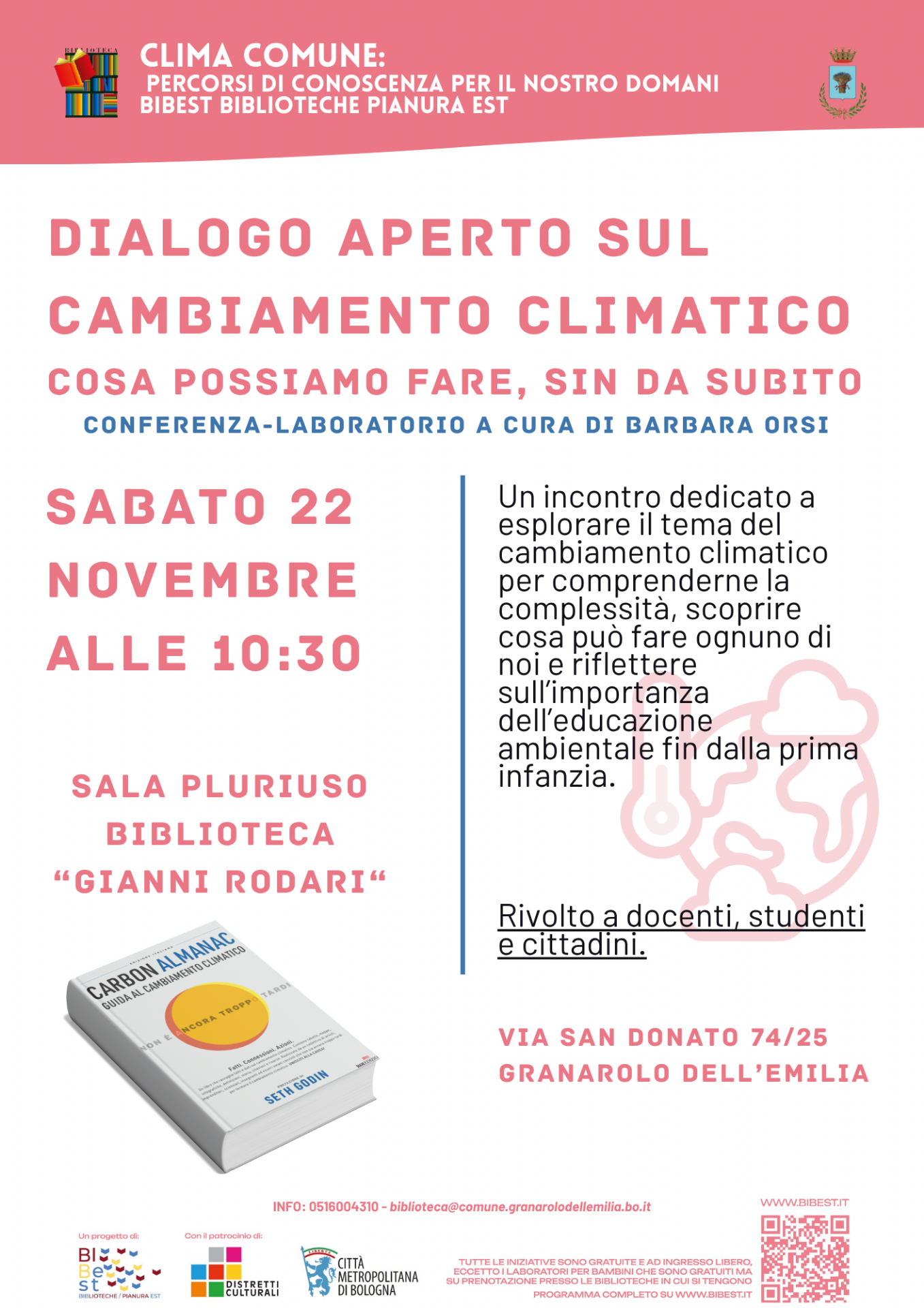 Sabato 22 novembre alle ore 10.30, nella sala polifunzionale della Biblioteca "Gianni Rodar"i di Granarolo dell’Emilia, si terrà la conferenza-laboratorio “Dialogo aperto sul cambiamento climatico: cosa possiamo fare, sin da subito”, a cura di Barbara Orsi.
