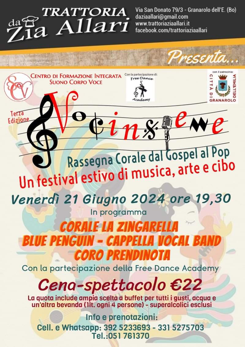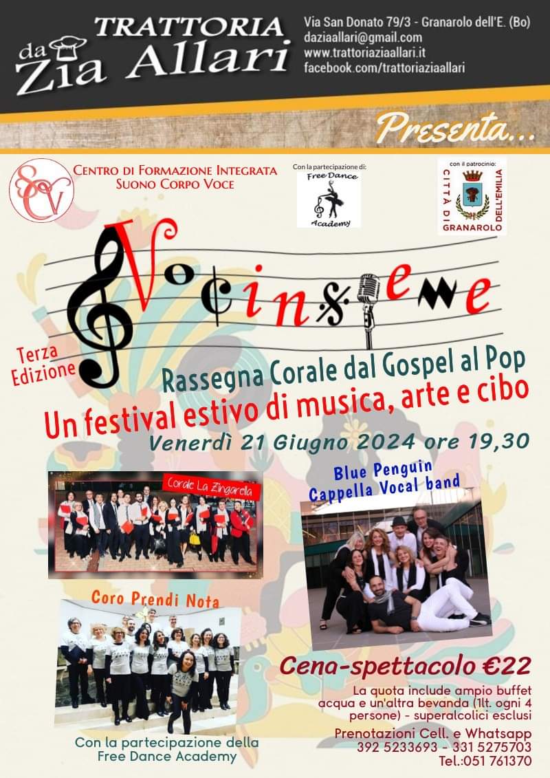 La Trattoria da Zia Allari ospita la terza edizione di "Vocinsieme", una rassegna corale che spazia dal gospel al pop, venerdì 21 giugno 2024 dalle ore 19:30. Questo festival estivo di musica, arte e cibo è organizzato dal Centro di Formazione Integrata Suono Corpo Voce Santa Caterina de' Vigri, e vedrà la partecipazione di diversi gruppi corali e artisti.