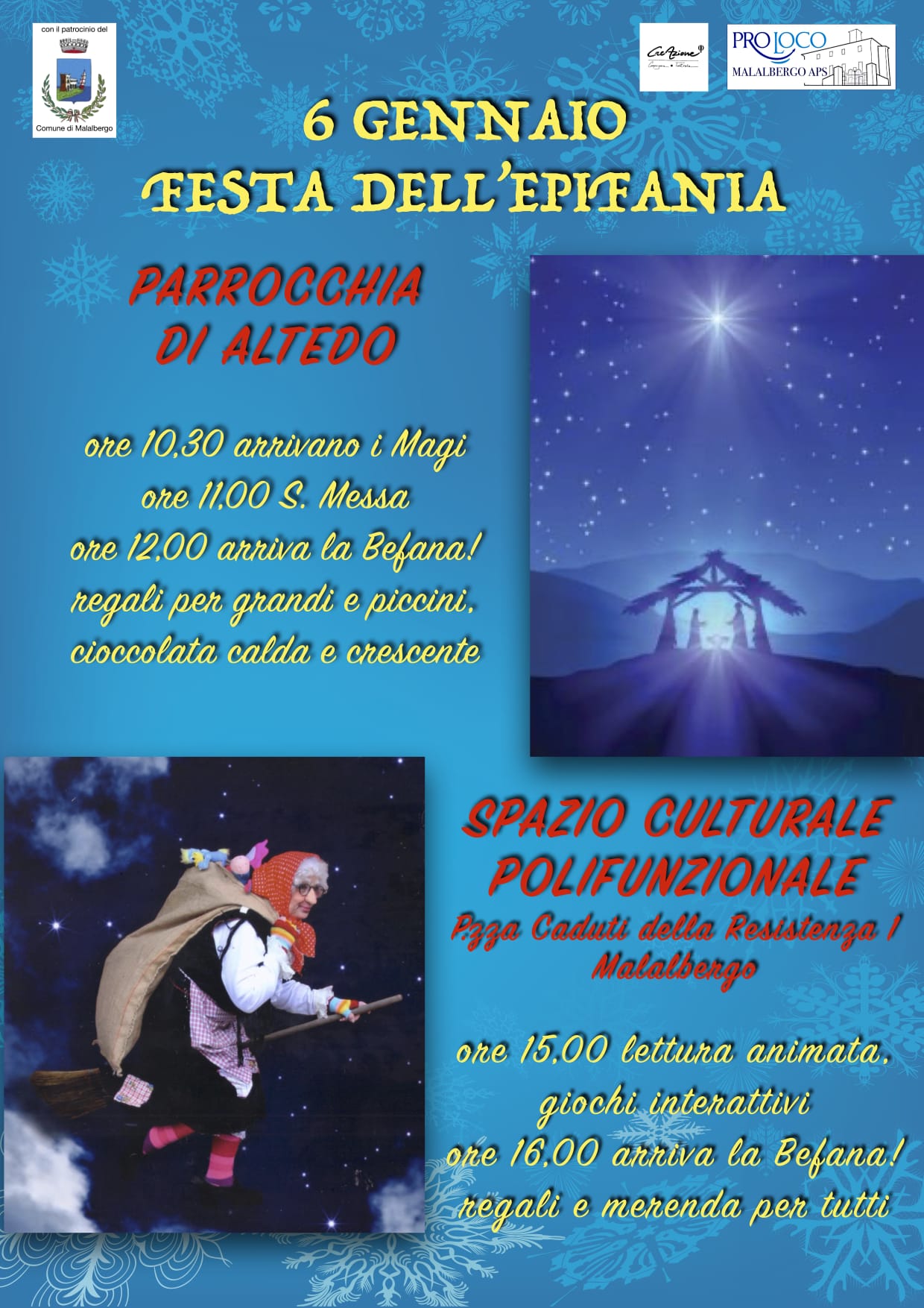 - Ore 12:00 Arriva la Befana con regali per grandi e piccini, cioccolata calda e crescente.