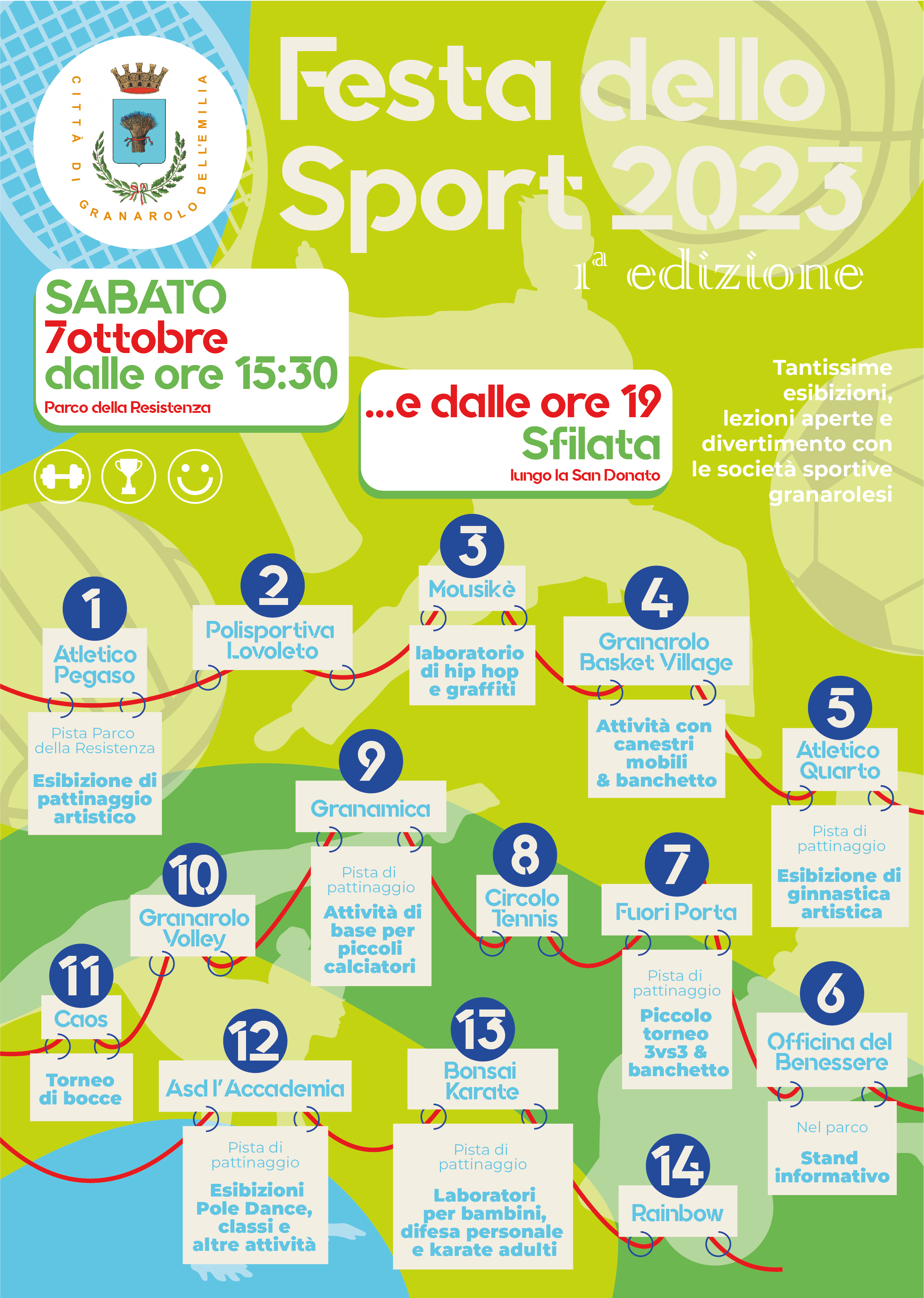A partire dalle ore 15.30 del sabato al Parco della Resistenza, nel centro del capoluogo, le associazioni dello sport daranno vita a un vero e proprio Villaggio dello Sport con tantissime esibizioni, lezioni aperte e promozione delle proprie attività, per incontrare tutti coloro che ancora non praticano uno sport o che vogliono saperne di più sull’offerta di discipline e corsi che si può trovare a Granarolo.