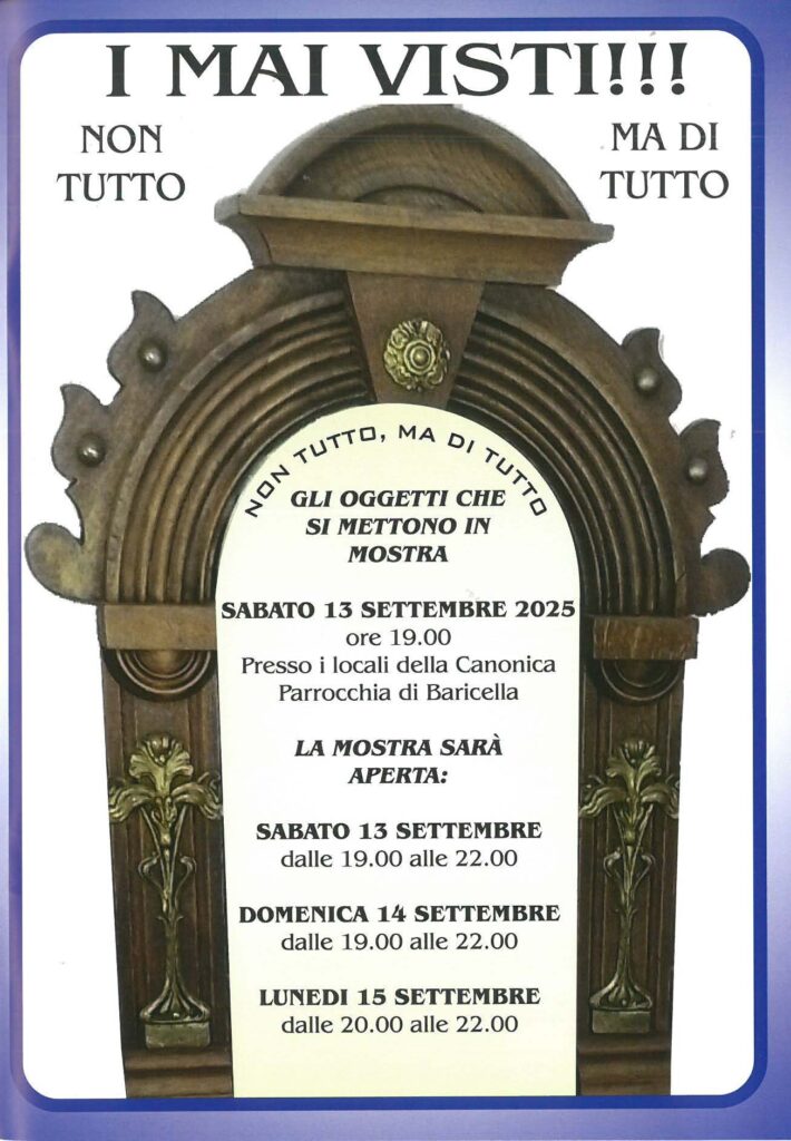 Dal 12 al 15 Settembre si terrà la tradizionale festa in occasione della Solennità della Natività della Beata Vergine Maria alla quale è consacrata la Chiesa di Baricella.