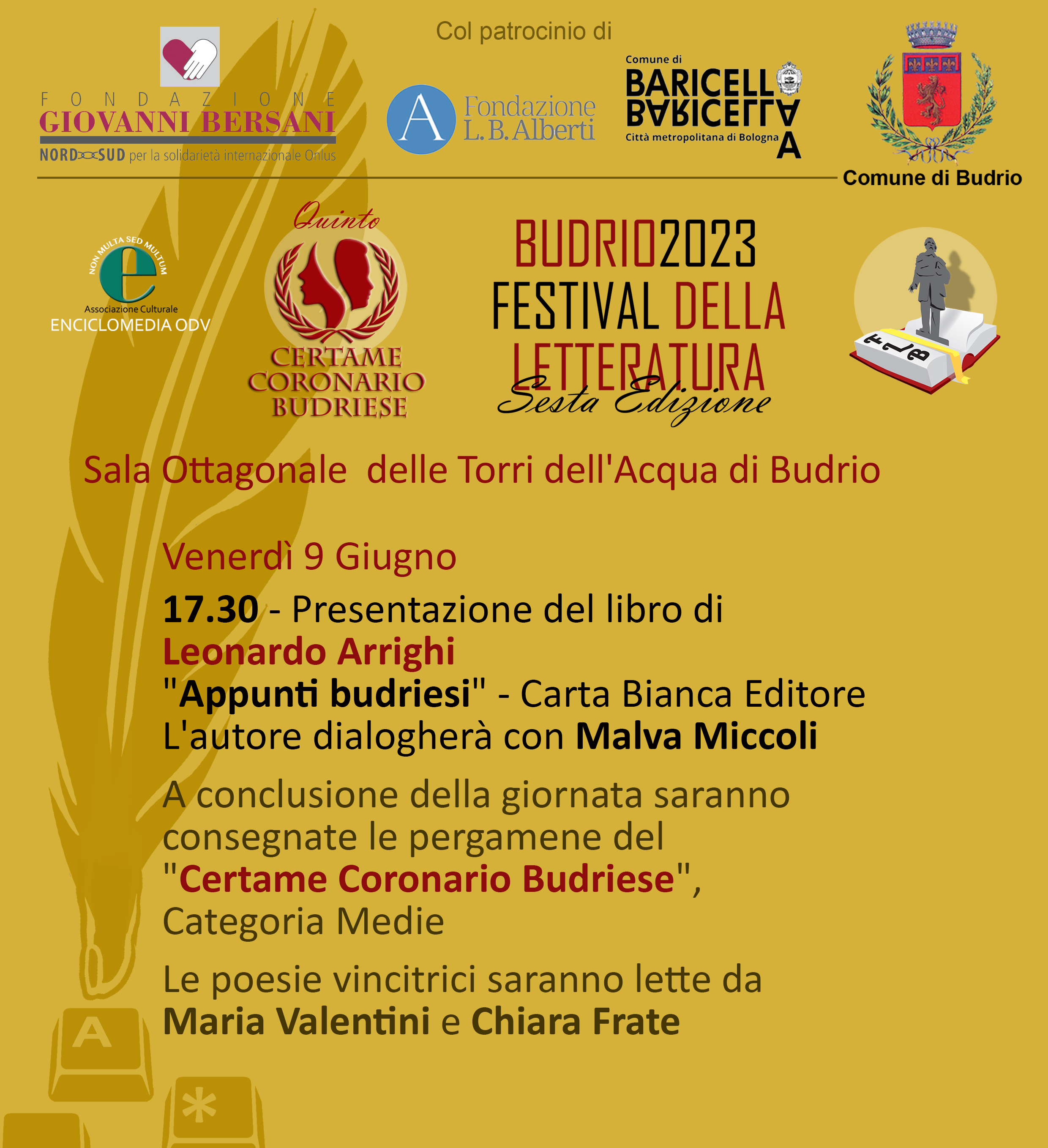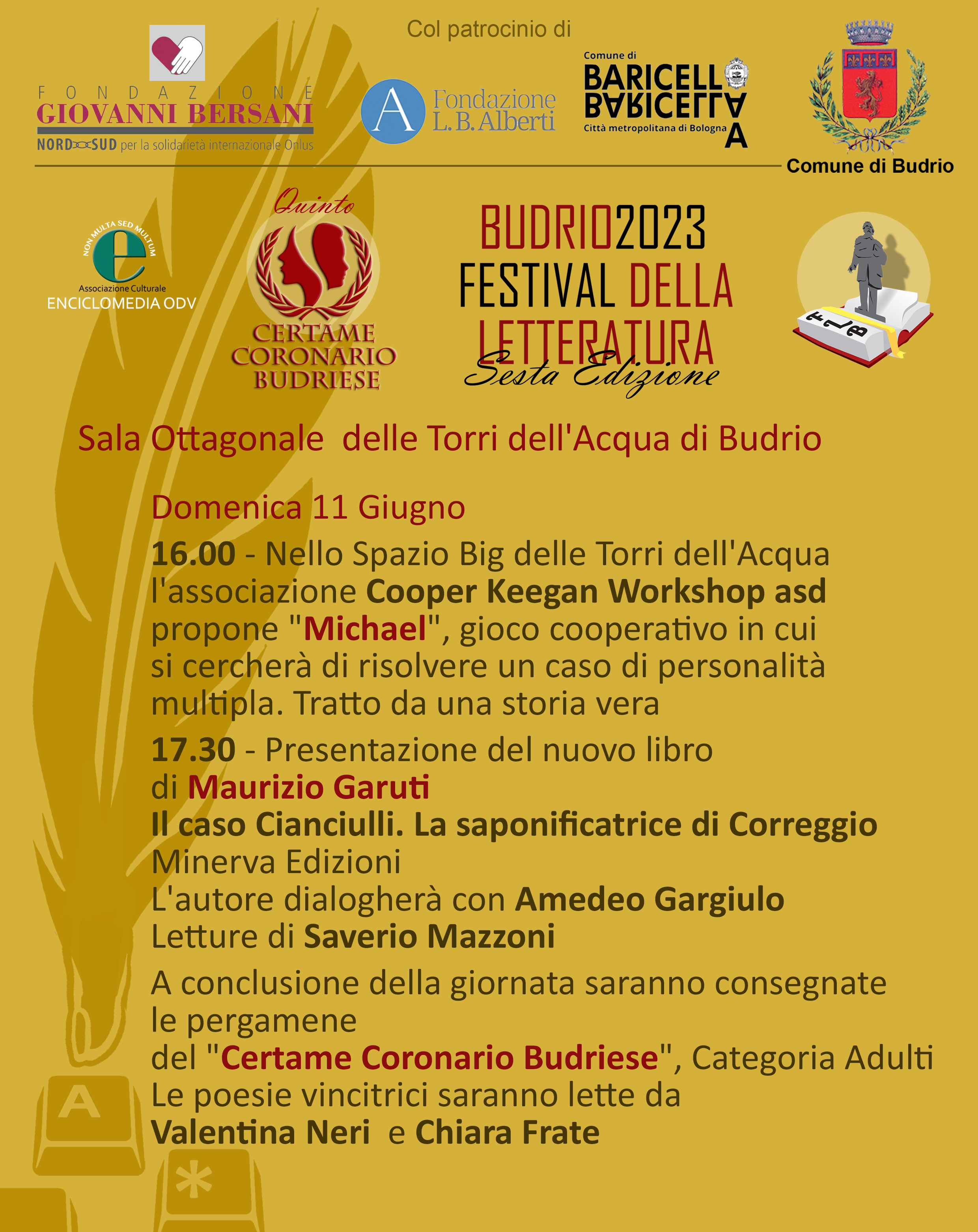 Torna il 9, 10 e l'11 Giugno il Festival della Letteratura di Budrio, con tre giorni all'insegna della cultura tra presentazioni di libri, dialoghi con gli autori e workshop. La manifestazione si concluderà con le premiazioni del Certame Coronario Budriese che quest'anno aveva come tema "il gioco".