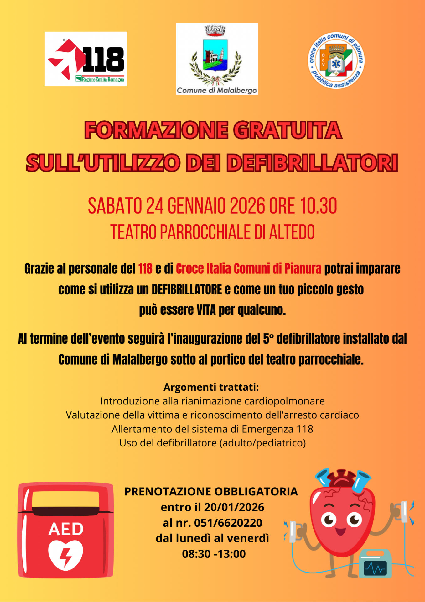 Al termine dell'evento verrà inaugurato il 5° defibrillatore installato dal Comune di Malalbergo sotto al portico del teatro parrocchiale.
