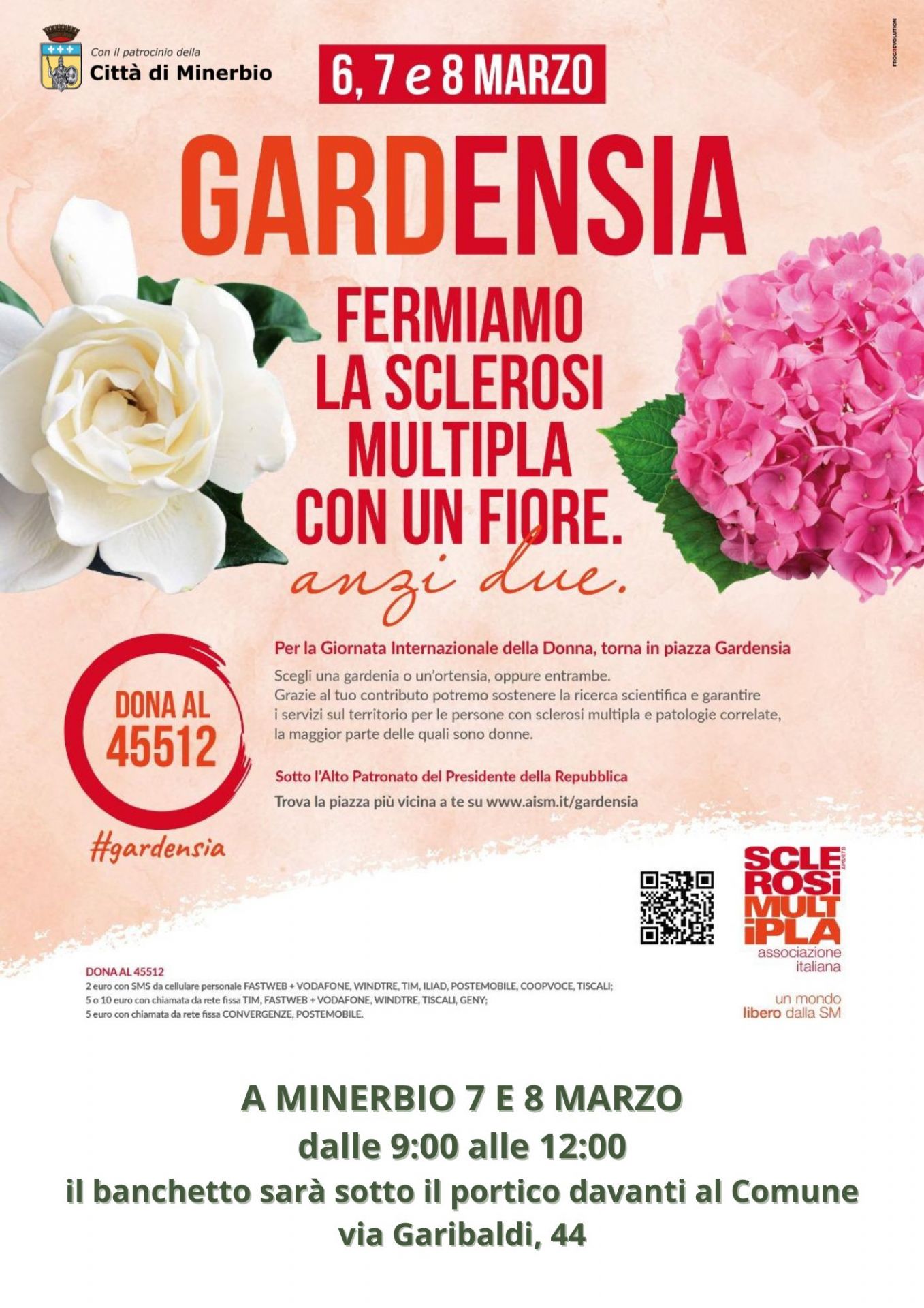 "Gardensia", manifestazione organizzata da AISM (Associazione nazionale italiana sclerosi multipla) e patrocinata dal Comune di Minerbio, sarà celebrata il 7 e l'8 marzo 2026, in occasione della Giornata Internazionale della Donna, presso il portico antistante la sede comunale, in via Garibaldi 44.