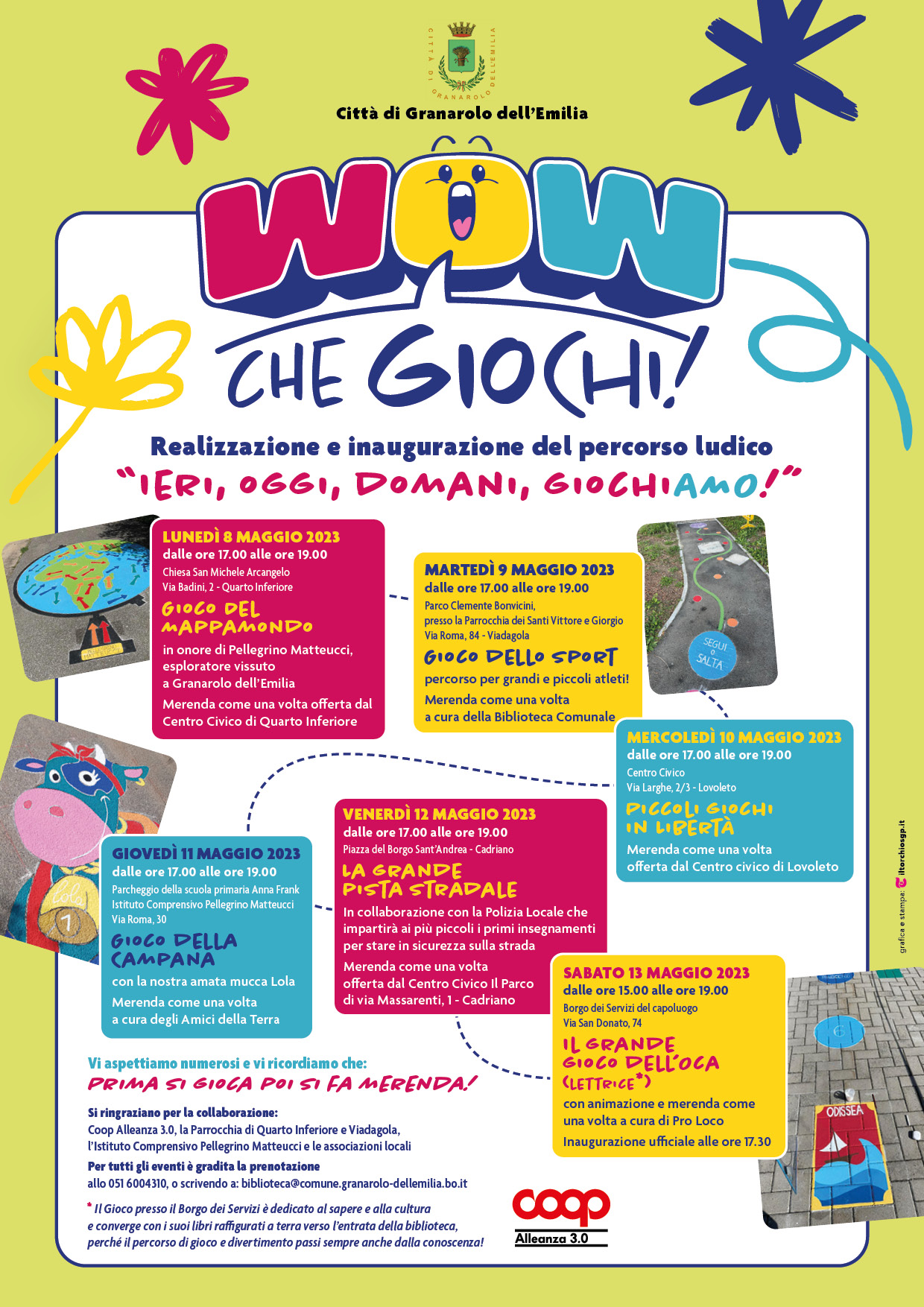 Momento clou sarà poi sabato 13 maggio, dalle 15 alle 19, al Borgo Servizi di Granarolo, dove la Pro Loco curerà i festeggiamenti per il Gioco dell’Oca che conduce alla biblioteca.