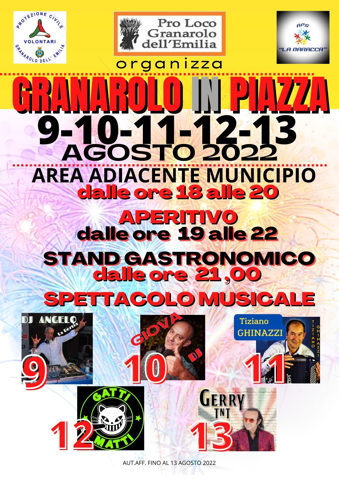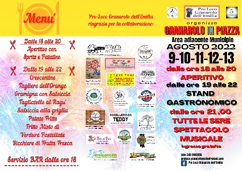La Pro-Loco di Granarolo, in collaborazione con l'Associazione di Protezione Civile di Granarolo dell'Emilia e l'Associazione La Baracca, organizza dal 9 al 13 agosto "Granarolo in Piazza".