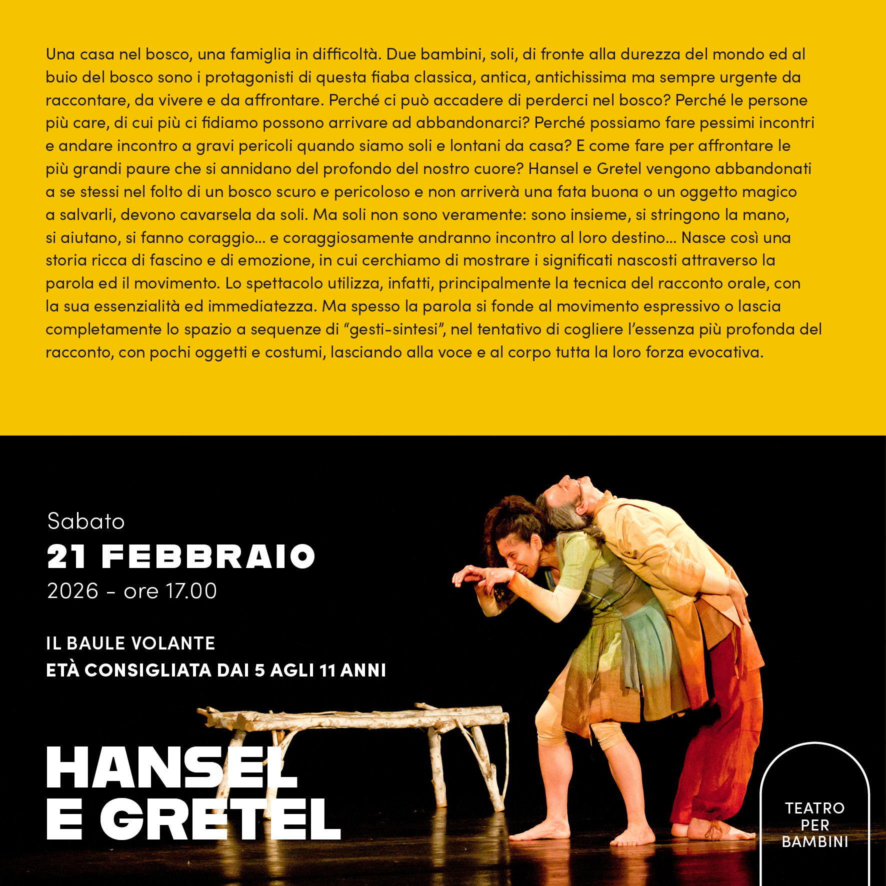 Sabato 21 Febbraio 2026 alle ore 17.00 si terrà a Palazzo Minerva lo spettacolo "Hansel e Gretel", dell'Associazione il Baule Volante.