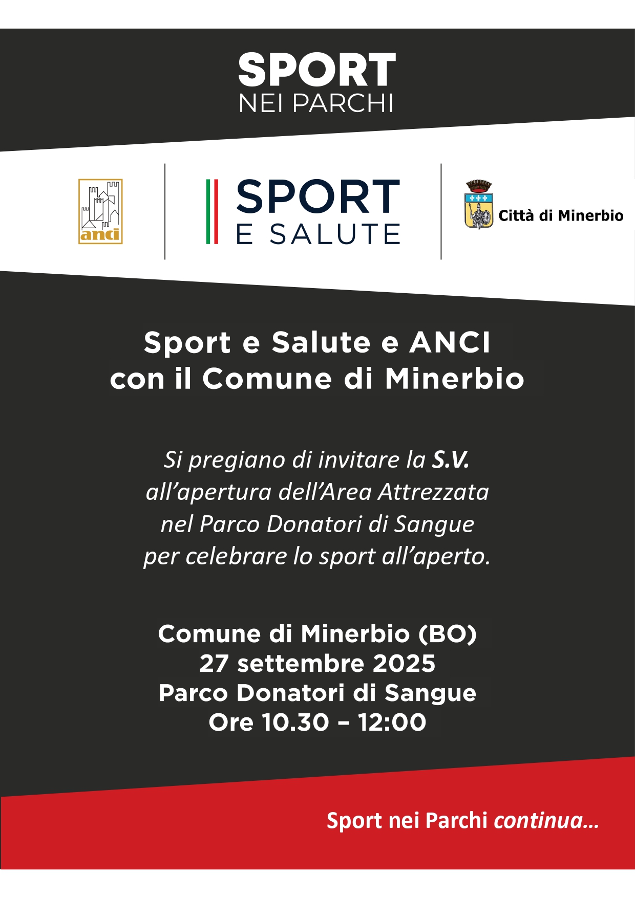 Il Comune di Minerbio, ha aderito al progetto Sport di TUTTI – Parchi, ideato da Sport e Salute S.p.A (la società dello Stato per la promozione dello sport e dei sani stili di vita) promosso assieme ad ANCI (Associazione Nazionale Comuni Italiani).