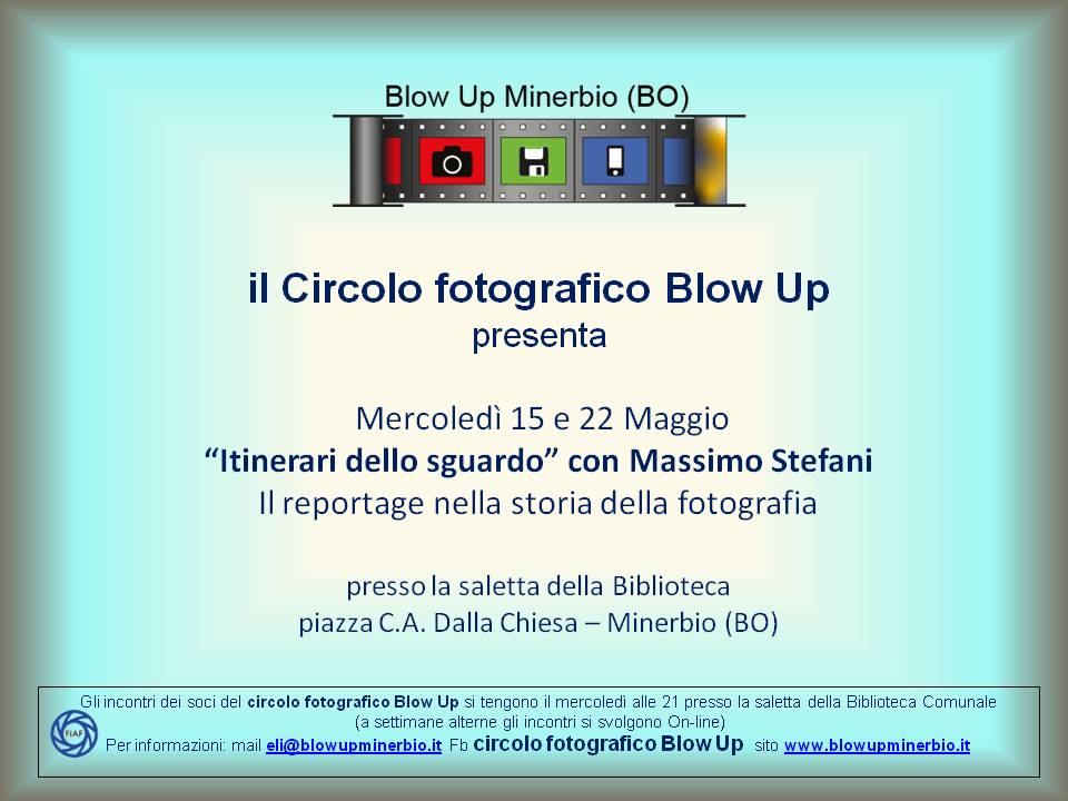 Il circolo fotografico Blow up presenta mercoledì 22 maggio 2024 alle ore 21.00 presso la saletta multimediale della Biblioteca comunale in Piazza C.A. Dalla Chiesa a Minerbio il terzo incontro del ciclo "Itinerari nello sguardo: storia della fotografia" con Massimo Stefani dal tema: Il reportage