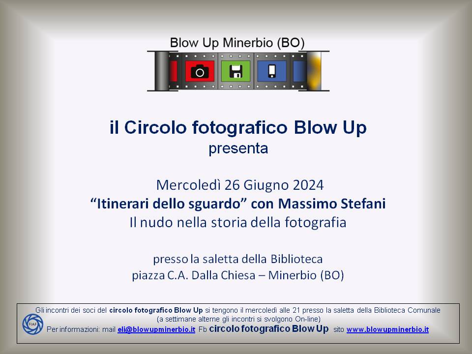 Il circolo fotografico Blow up presenta mercoledì 26 giugno 2024 alle ore 21.00 presso la saletta multimediale della Biblioteca comunale in Piazza C.A. Dalla Chiesa a Minerbio l'ultimo incontro del ciclo "Itinerari nello sguardo: storia della fotografia" con Massimo Stefani dal tema: Il nudo