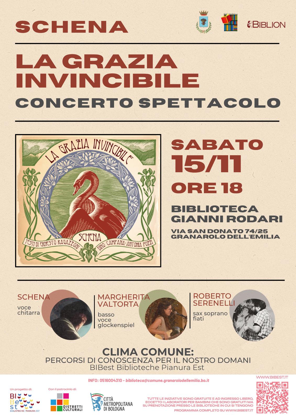 Sabato 15 novembre alle ore 18.00, la Biblioteca Gianni Rodari di Granarolo dell’Emilia (via San Donato 74/25) ospiterà il concerto spettacolo “La grazia invincibile” del cantautore e chitarrista bolognese Paolo Schena, accompagnato da Margherita Valtorta (basso, voce, glockenspiel) e Roberto Serenelli (sax soprano, fiati).