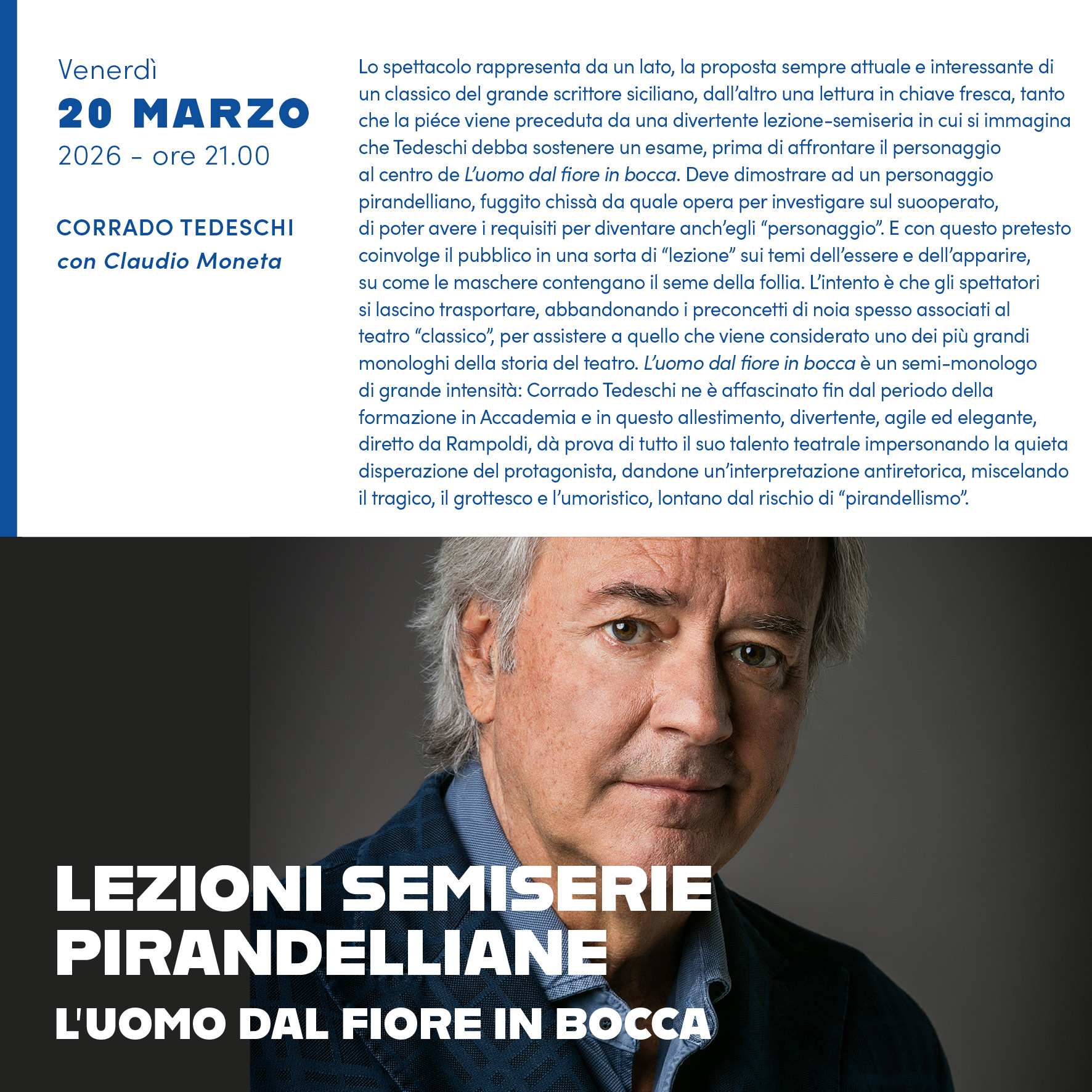 Venerdì 20 Marzo 2026 alle ore 21.00 si terrà a Palazzo Minerva lo spettacolo "Lezioni semiserie pirandelliane. L'uomo dal fiore in bocca", con Corrado Tedeschi e Claudio Moneta all'interno della stagione teatrale 2025/2026 di Palazzo Minerva.
