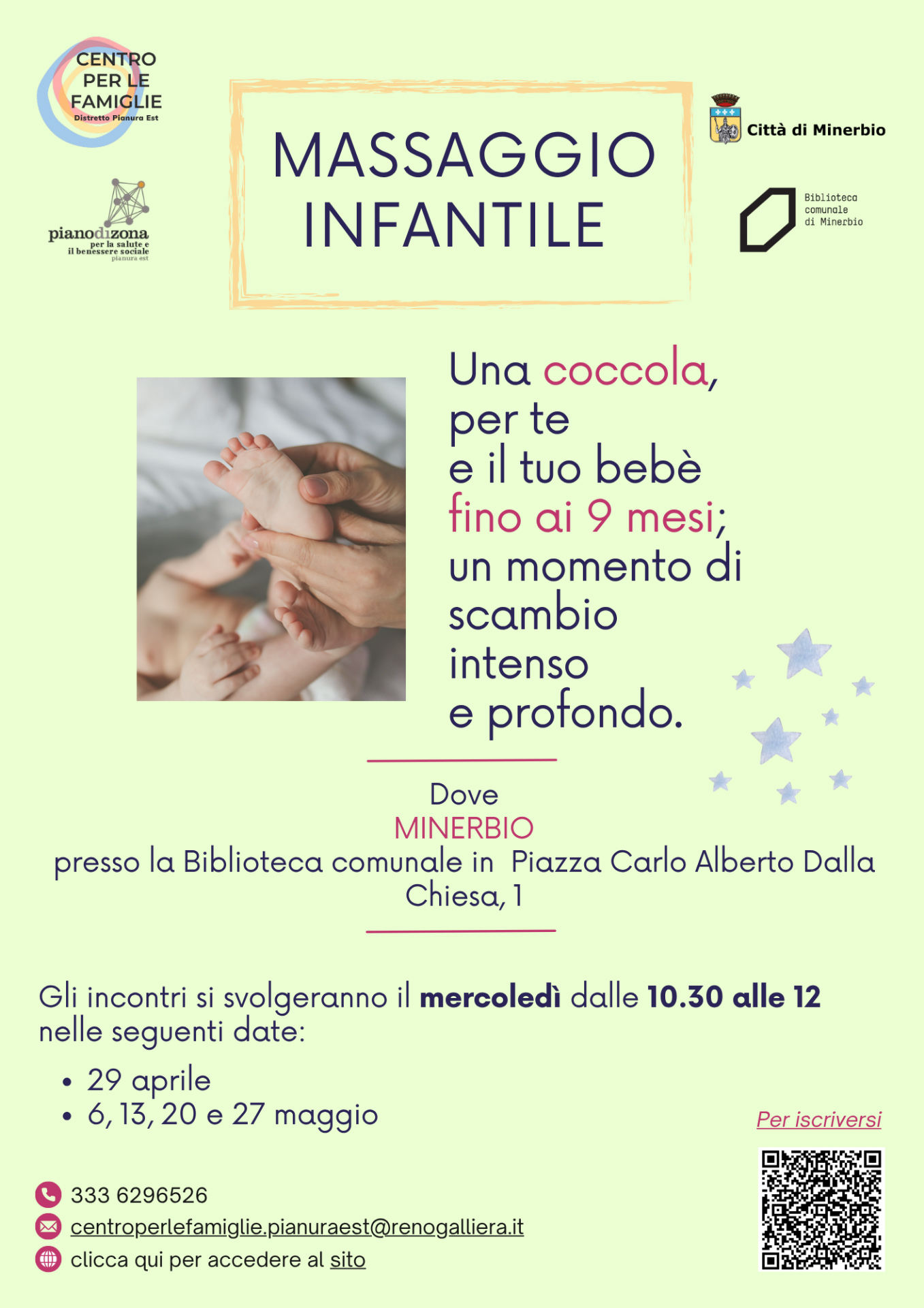 Il Centro per le famiglie del Distretto Pianura est organizza il corso di massaggio infantile per neonati/e da 0 a 9 mesi a Minerbio presso la Biblioteca Comunale (Piazza C.A. Dalla Chiesa, 1) mercoledì 29 aprile e mercoledì 6, 13, 20 e 27 maggio 2026 dalle ore 10.30 alle ore 12.00.