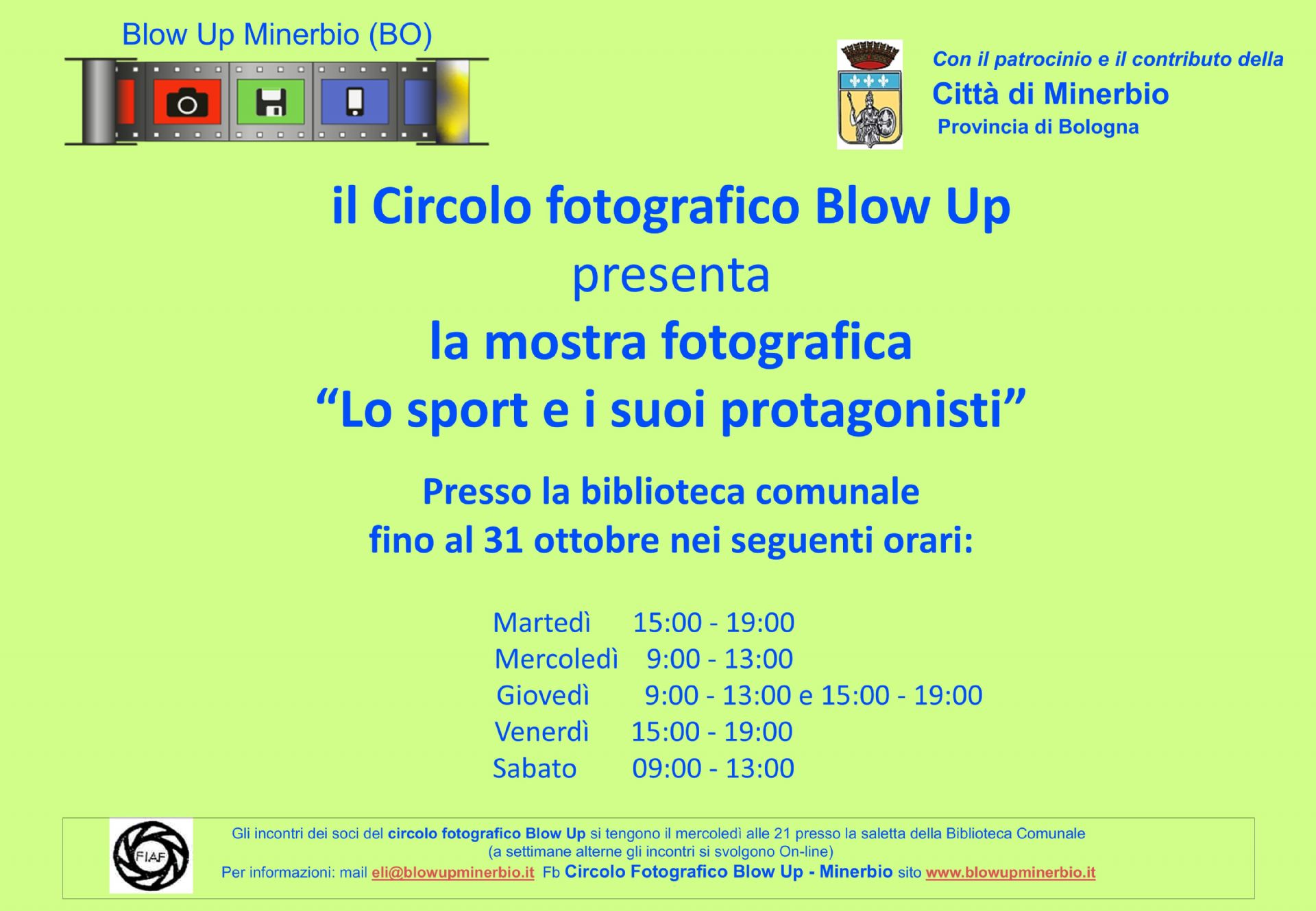 Il Circolo Fotografico Blow Up, con il patrocinio e il contributo del Comune di Minerbio, presenta la nuova mostra fotografica "Lo sport e i suoi protagonisti", ospitata presso la Biblioteca Comunale Prometeo di Minerbio.