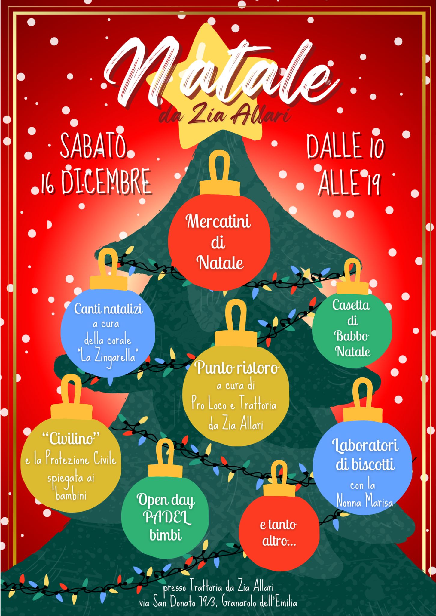 Sabato 16 dicembre, dalle ore 10 alle 19, la Trattoria da Zia Allari (via San Donato 79/3) organizza "Natale da Zia Allari" con mercatino e casetta di Babbo Natale, canti natalizi con la corale "La Zingarella", punto ristoro della Pro-Loco e Zia Allari, laboratori di biscotti, "Civilino" e la Protezione Civile spiegata ai bambini, open day sportivi.