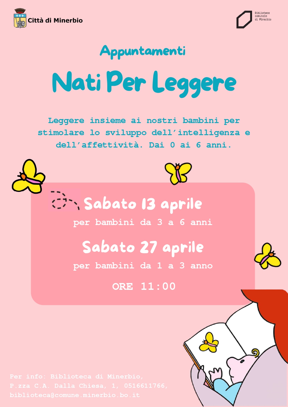 Sabato 13 aprile 2024 alle ore 11.00 si terrà presso la Biblioteca Comunale di Minerbio l'appuntamento con Nati per leggere, per bambini da 3 a 6 anni.