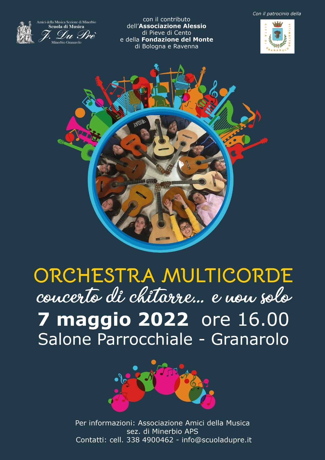 Sabato 7 maggio, alle ore 16, la Scuola di Musica "Du Prè" organizza "Orchestra Multicorde", concerto di chitarre e non solo, presso il salone parrocchiale di Granarolo. L'evento, che ha il contributo dell'Associazione Alessio di Pieve di Cento e della Fondazione del Monte, è patrocinato dal Comune di Granarolo dell'Emilia.
