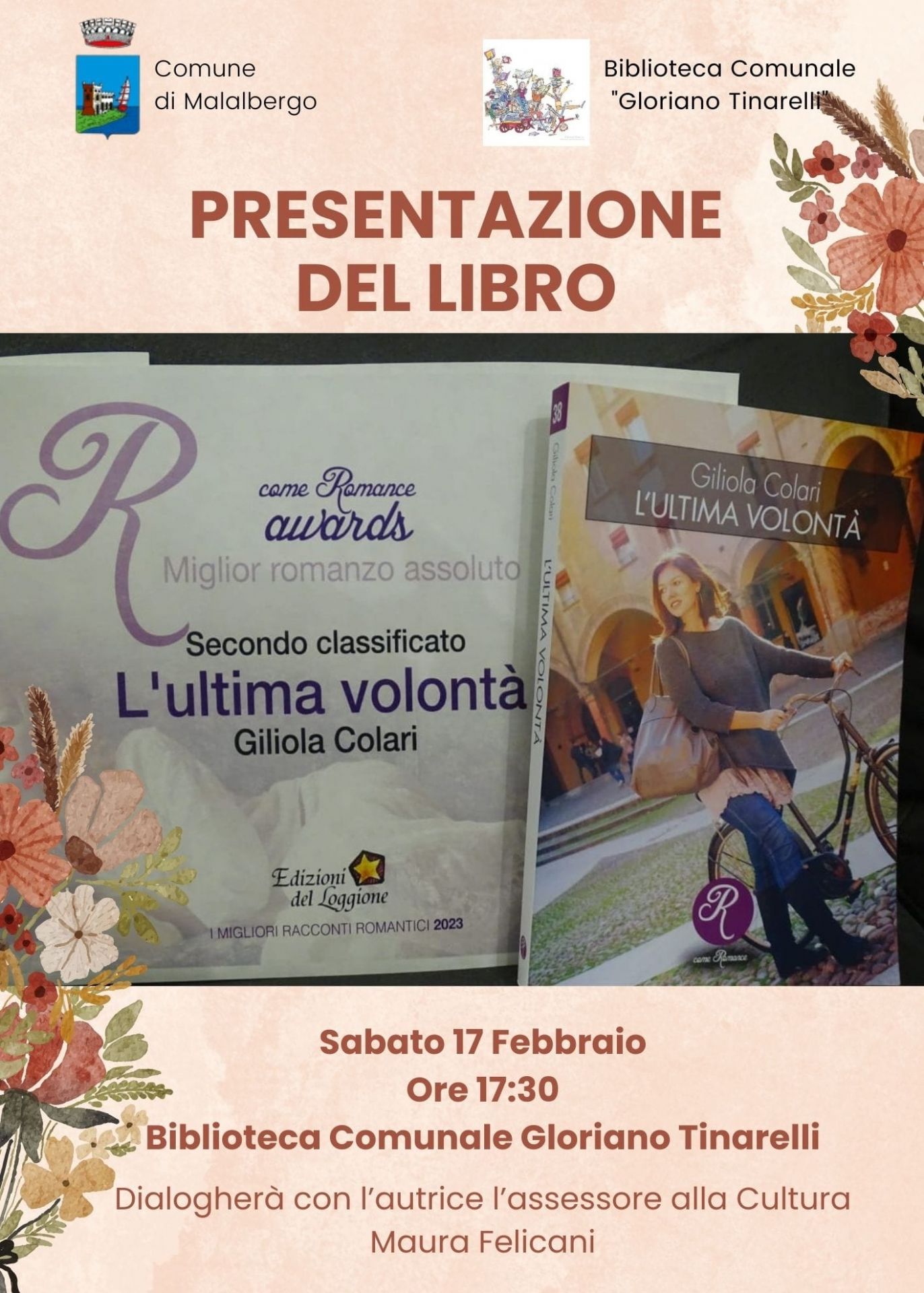 Sabato 17 Febbraio ore 17:30 in Biblioteca Comunale Gloriano Tinarelli si svolgerà la presentazione del libro L'ultima volontà di Giliola Colari.