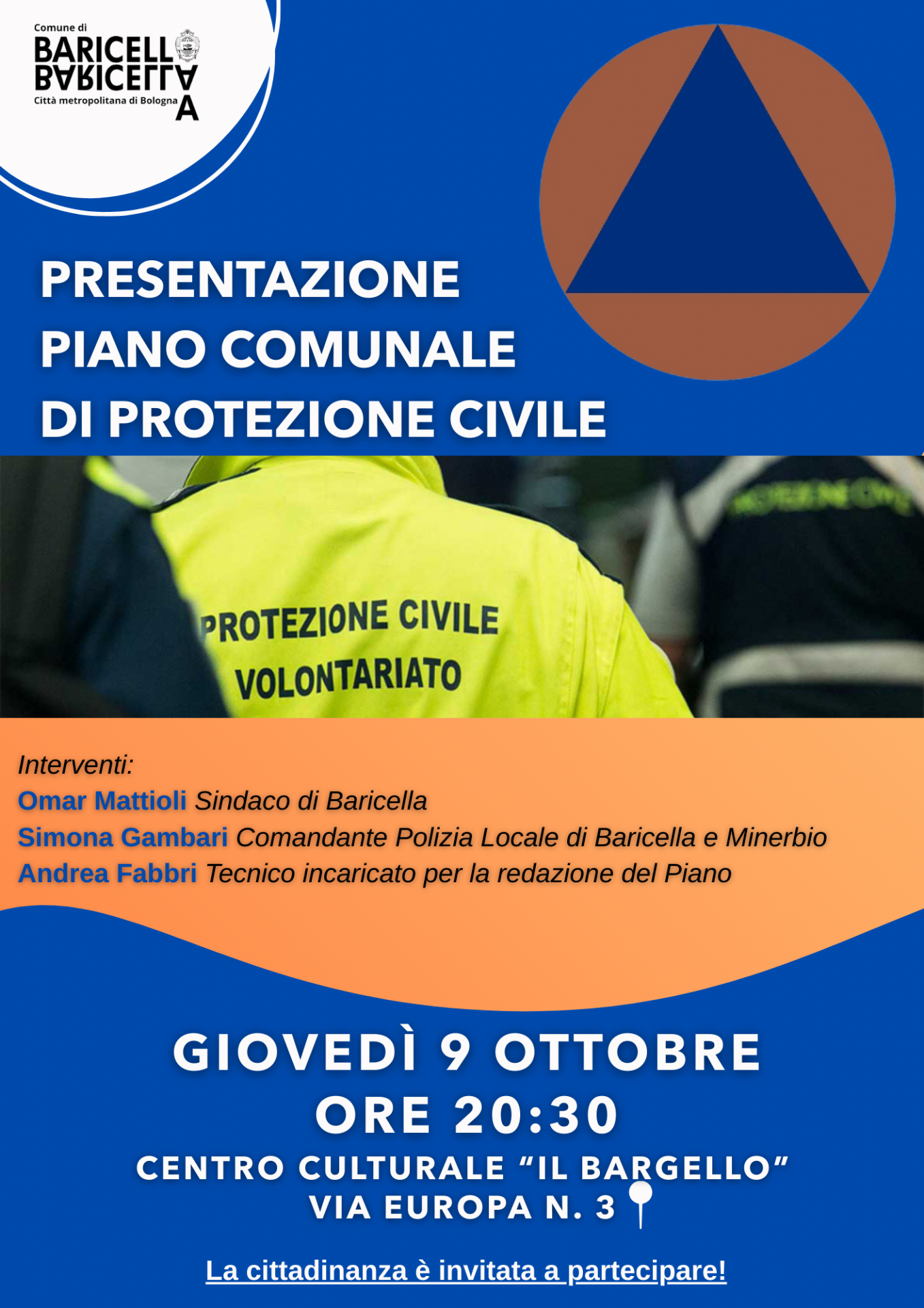 Giovedì 9 ottobre, alle ore 20:30, presso il Centro Culturale Il Bargello (Via Europa 3, Baricella), si terrà la presentazione del Piano Comunale di Protezione Civile.