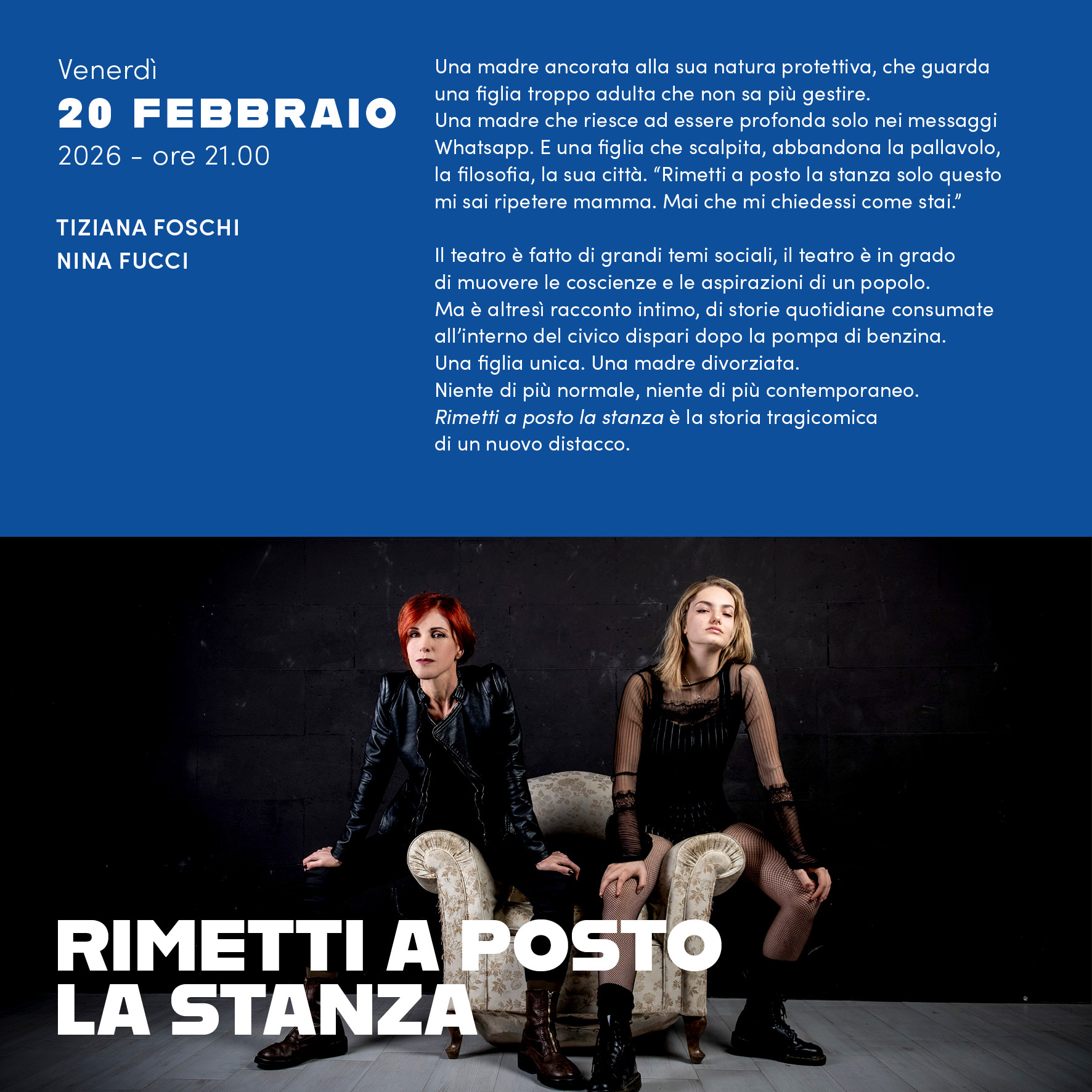 Venerdì 26 Febbraio 2026 alle ore 21.00 si terrà a Palazzo Minerva lo spettacolo "Rimetti a posto la stanza", con Tiziana Foschi e Nina Fucci all'interno della stagione teatrale 2025/2026 di Palazzo Minerva.