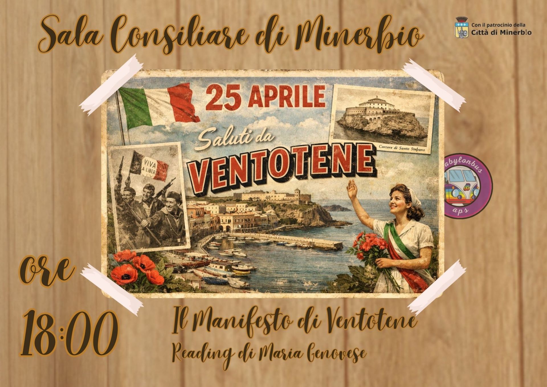 In occasione dell'81° anniversario della Liberazione, con il Patrocinio del Comune di Minerbio, sabato 25 aprile 2026 alle ore 18.00 nella Sala Consiliare del Comune di Minerbio si terrà "Saluti da Ventotene", reading teatrale di Maria Genovese, a cura di Babylonbus Aps.