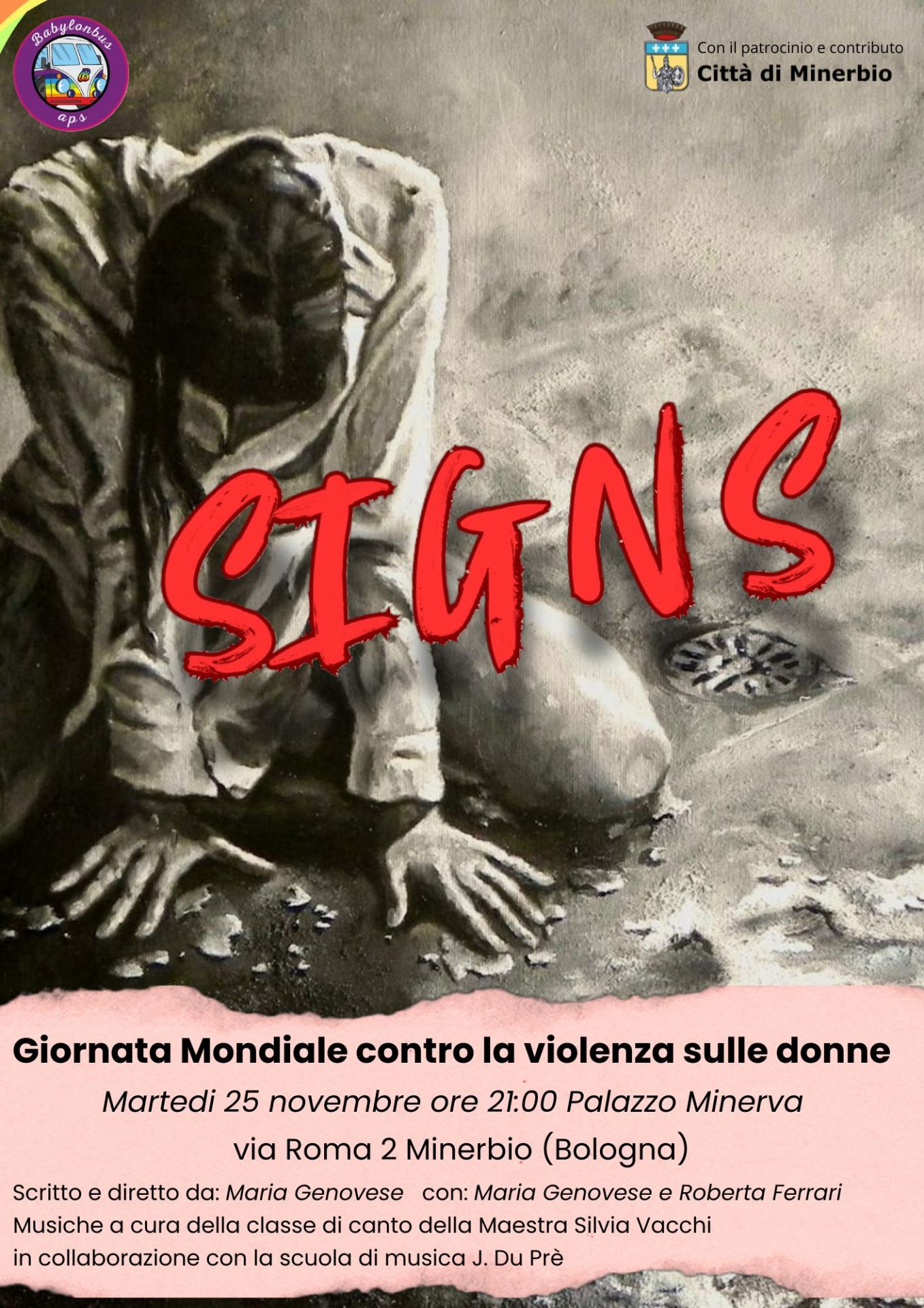 Martedì 25 novembre alle ore 21:00, in occasione della Giornata Mondiale contro la Violenza sulle Donne, l’Amministrazione Comunale di Minerbio è orgogliosa di patrocinare e sostenere lo spettacolo teatrale “SIGNS”, un’opera intensa e commovente scritta e diretta da Maria Genovese, che vedrà in scena la stessa autrice insieme a Roberta Ferrari.