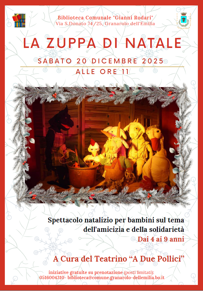 Sabato 20 dicembre 2025, alle ore 11.00, la Biblioteca comunale Gianni Rodari ospiterà “La Zuppa di Natale”, uno spettacolo dedicato ai più piccoli per vivere insieme la magia delle feste attraverso una storia che parla di amicizia e solidarietà.