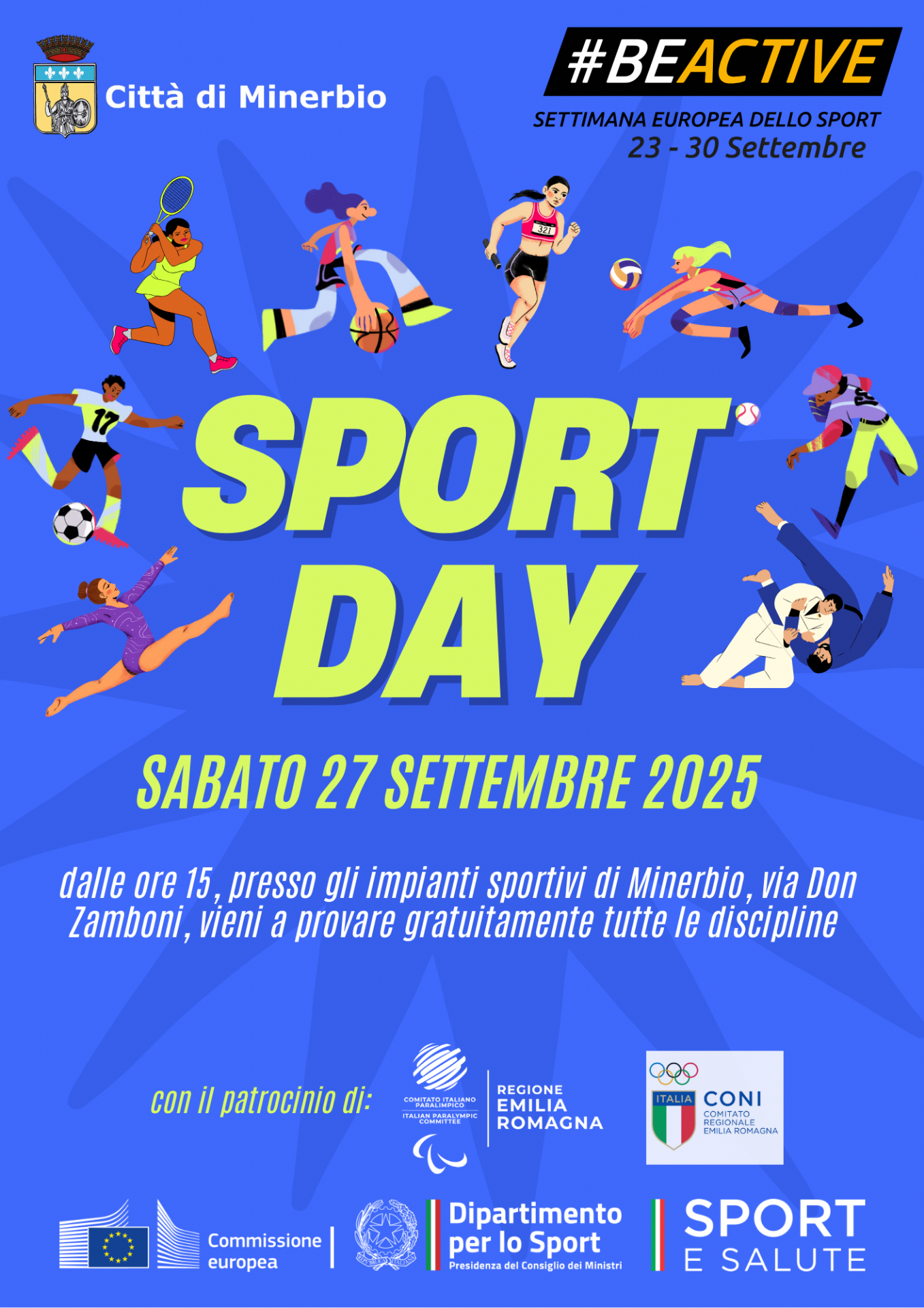 Sabato 27 settembre presso gli Impianti sportivi di Minerbio (via Don Zamboni), dalle ore 15.00 si terrà l’evento Sport Day, organizzato dall’Amministrazione Comunale nell’ambito della Settimana Europea dello Sport 2025, promossa dalla Commissione Europea e coordinata dall’Ufficio per lo sport della Presidenza del Consiglio dei Ministri.