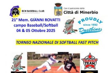 Sabato 4 e Domenica 5 ottobre 2025 BCM Baseball Club organizza il 21° MEMORIAL GIANNI ROVATTI presso Campo da Baseball di Minerbio (Via Don Zamboni, 5), torneo nazionale F.I.B.S. di Softball...